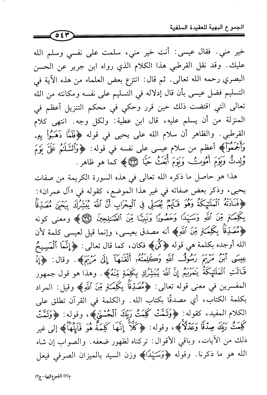 هَذَا هُوَ حَاصِلُ مَا ذَكَرَهُ اللَّهُ تَعَالَى فِي هَذِهِ السُّورَةِ الْكَرِيمَةِ مِنْ صِفَاتِ يَحْيَى، وَذَكَرَ بَعْضَ صِفَاتِهِ فِي غَيْرِ هَذَا الْمَوْضِعِ، كَقَوْلِهِ فِي «آلِ عِمْرَانَ» : {فَنَادَتْهُ الْمَلَائِكَةُ وَهُوَ قَائِمٌ يُصَلِّى فِى الْمِحْرَابِ أَنَّ اللَّهَ يُبَشِّرُكَ بِيَحْيَى مُصَدِّقاً بِكَلِمَةٍ مِّنَ اللَّهِ وَسَيِّدًا وَحَصُورًا وَنَبِيًّا مِّنَ الصَّالِحِينَ} وَمَعْنَى كَوْنِهِ {مُصَدِّقاً بِكَلِمَةٍ مِّنَ اللَّهِ} أَنَّهُ مُصَدِّقٌ بِعِيسَى، وَإِنَّمَا قِيلَ لِعِيسَى كَلِمَةٌ لِأَنَّ اللَّهَ أَوْجَدَهُ بِكَلِمَةٍ هِيَ قَوْلُهُ «كُنْ» فَكَانَ، كَمَا قَالَ تَعَالَى: {إِنَّمَا الْمَسِيحُ عِيسَى ابْنُ مَرْيَمَ رَسُولُ اللَّهِ وَكَلِمَتُهُ أَلْقَاهَا إِلَى مَرْيَمَ} . وَقَالَ: {إِذْ قَالَتِ الْمَلَائِكَةُ يامَرْيَمُ إِنَّ اللَّهَ يُبَشِّرُكِ بِكَلِمَةٍ مِّنْهُ} . وَهَذَا هُوَ قَوْلُ جُمْهُورِ الْمُفَسِّرِينَ فِي مَعْنَى قَوْلِهِ تَعَالَى: {مُصَدِّقاً بِكَلِمَةٍ مِّنَ اللَّهِ} وَقِيلَ: الْمُرَادُ بِكَلِمَةٍ الْكِتَابُ، أَيْ مُصَدِّقًا بِكِتَابِ اللَّهِ. وَالْكَلِمَةُ فِي الْقُرْآنِ تُطْلَقُ عَلَى الْكَلَامِ الْمُفِيدِ، كَقَوْلِه: {وَتَمَّتْ كَلِمَتُ رَبِّكَ الْحُسْنَى} ، وَقَوْلِهِ: {وَتَمَّتْ كَلِمَةُ رَبِّكَ صِدْقاً وَعَدْلاً} ، وَقَوْلِهِ: {كَلاَّ إِنَّهَا كَلِمَةٌ هُوَ قَآئِلُهَا} إِلَى غَيْرِ ذَلِكَ مِنَ الْآيَاتِ، وَبَاقِيَ الْأَقْوَالِ: تَرَكْنَاهُ لِظُهُورِ ضَعْفِهِ. وَالصَّوَابُ إِنْ شَاءَ اللَّهُ هُوَ مَا ذَكَرْنَا. وَقَوْلُهُ «وَسَيِّدًا» وَزْنُ السَّيِّدِ بالميزان الصرفي فيعل