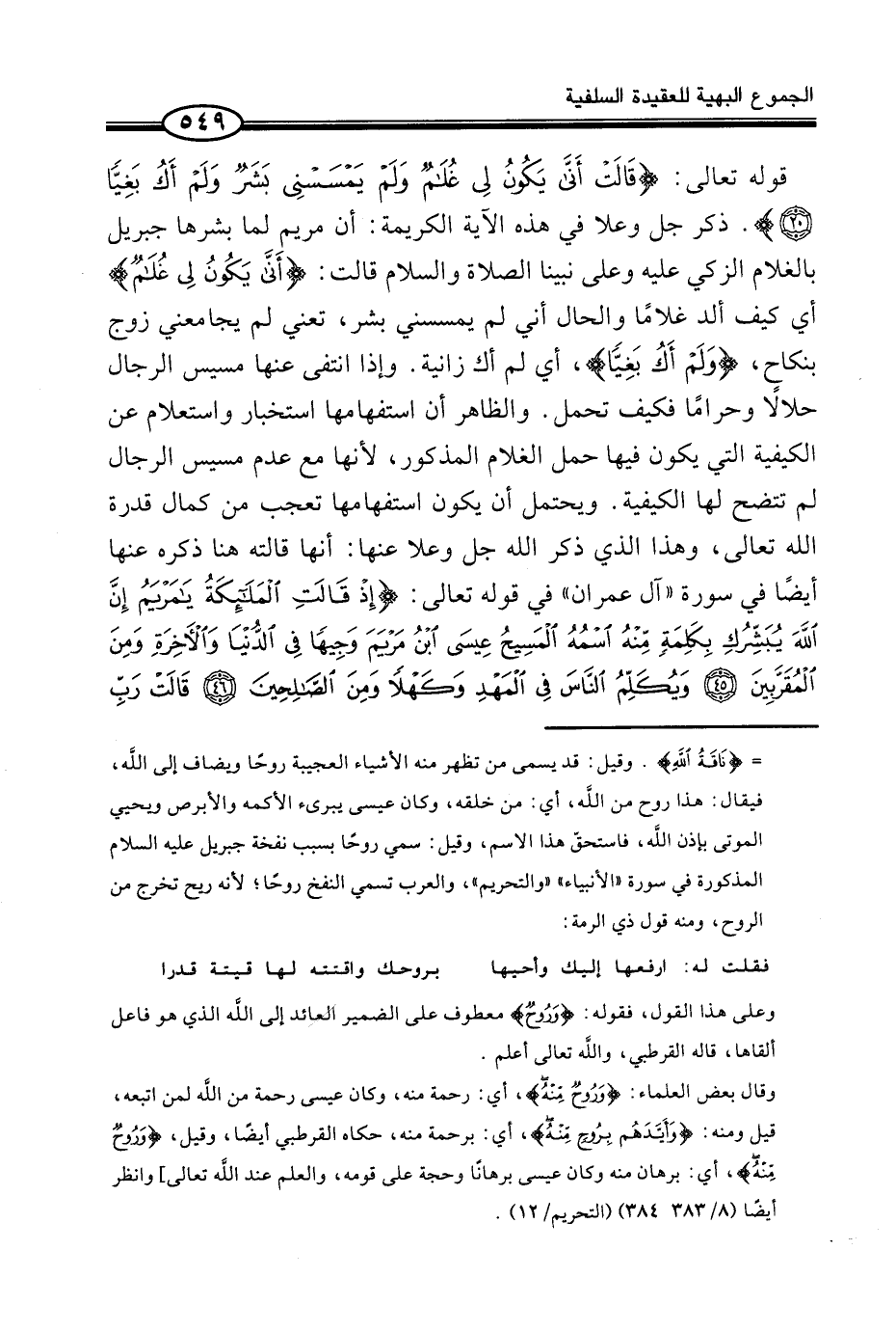 قَوْلُهُ تَعَالَى: {قَالَتْ أَنَّى يَكُونُ لِى غُلَامٌ وَلَمْ يَمْسَسْنِى بَشَرٌ وَلَمْ أَكُ بَغِيّاً} . ذَكَرَ جَلَّ وَعَلَا فِي هَذِهِ الْآيَةِ الْكَرِيمَةِ: أَن مَرْيَمَ لَمَّا بَشَّرَهَا جِبْرِيلُ بِالْغُلَامِ الزَّكِيِّ عَلَيْهِ وَعَلَى نَبِيِّنَا الصَّلَاةُ وَالسَّلَامُ قَالَتْ: {أَنَّى يَكُونُ لِى غُلَامٌ} أَيْ كَيْفَ أَلِدُ غُلَامًا وَالْحَالُ أَنِّي لَمْ يَمْسَسْنِي بَشَرٌ، تَعْنِي لَمْ يُجَامِعْنِي زَوْجٌ بِنِكَاحٍ، {وَلَمْ أَكُ بَغِيّاً} ، أَيْ لَمْ أَكُ زَانِيَةً. وَإِذَا انْتَفَى عَنْهَا مَسِيسُ الرِّجَالِ حَلَالًا وَحَرَامًا فَكَيْفَ تَحْمِلُ. وَالظَّاهِرُ أَنَّ اسْتِفْهَامَهَا اسْتِخْبَارٌ وَاسْتِعْلَامٌ عَنِ الْكَيْفِيَّةِ الَّتِي يَكُونُ فِيهَا حَمْلُ الْغُلَامِ الْمَذْكُورِ، لِأَنَّهَا مَعَ عَدَمِ مَسِيسِ الرِّجَالِ لَمْ تَتَّضِحْ لَهَا الْكَيْفِيَّةُ. وَيُحْتَمَلُ أَنْ يَكُونَ اسْتِفْهَامُهَا تَعَجُّبٌ مِنْ كَمَالِ قُدْرَةِ اللَّهِ تَعَالَى، وَهَذَا الَّذِي ذَكَرَ اللَّهُ جَلَّ وَعَلَا عَنْهَا: أَنَّهَا قَالَتْهُ هُنَا ذَكَرَهُ عَنْهَا أَيْضًا فِي سُورَةِ «آلِ عِمْرَانَ» فِي قَوْلِهِ تَعَالَى: {إِذْ قَالَتِ الْمَلَائِكَةُ يامَرْيَمُ إِنَّ اللَّهَ يُبَشِّرُكِ بِكَلِمَةٍ مِّنْهُ اسْمُهُ الْمَسِيحُ عِيسَى ابْنُ مَرْيَمَ وَجِيهًا فِي الدُّنْيَا وَالآخِرَةِ وَمِنَ الْمُقَرَّبِينَ وَيُكَلِّمُ النَّاسَ فِى الْمَهْدِ وَكَهْلاً وَمِنَ الصَّالِحِينَ قَالَتْ رَبِّ