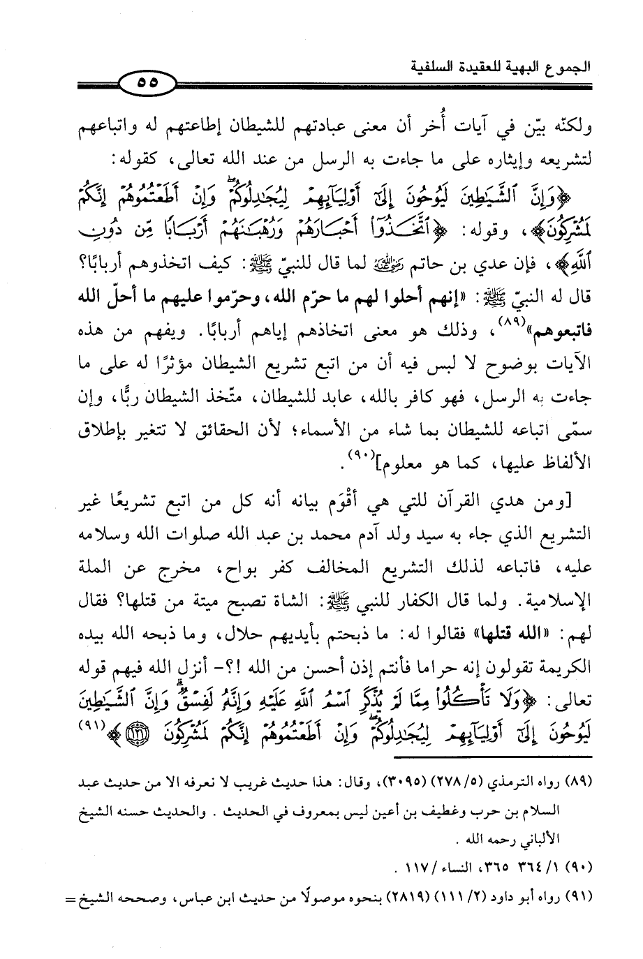 [وَمِنْ هَدْيِ الْقُرْآنِ لِلَّتِي هِيَ أقْوَم بَيَانُهُ أَنَّهُ كُلُّ مَنِ اتَّبَعَ تَشْرِيعًا غَيْرَ التَّشْرِيعِ الَّذِي جَاءَ بِهِ سَيِّدُ وَلَدِ آدَمَ مُحَمَّدُ بْنُ عَبْدِ اللَّهِ صَلَوَاتُ اللَّهِ وَسَلَامُهُ عَلَيْهِ، فَاتِّبَاعُهُ لِذَلِكَ التَّشْرِيعِ الْمُخَالِفِ كُفْرٌ بَوَاحٌ، مُخْرِجٌ عَنِ الْمِلَّةِ الْإِسْلَامِيَّةِ. وَلَمَّا قَالَ الْكُفَّارُ لِلنَّبِيِّ صَلَّى اللَّهُ عَلَيْهِ وَسَلَّمَ: الشَّاةُ تُصْبِحُ مَيِّتَةً مَنْ قَتَلَهَا؟ فَقَالَ لَهُمْ: «اللَّهُ قَتَلَهَا» فَقَالُوا لَهُ: مَا ذَبَحْتُمْ بِأَيْدِيهِمْ حَلَالٌ، وَمَا ذَبَحَهُ الله بِيَدِهِ الْكَرِيمَة تَقولُونَ إِنَّه حَرَامًا فَأَنْتُمْ إِذَنْ أَحْسَنُ مِنَ اللَّهِ!؟ - أَنْزَلَ اللَّهُ فِيهِمْ قَوْلَهُ تَعَالَى: (وَلاَ تَأْكُلُواْ مِمَّا لَمْ يُذْكَرِ اسْمُ اللَّهِ عَلَيْهِ وَإِنَّهُ لَفِسْقٌ وَإِنَّ الشَّيَاطِينَ لَيُوحُونَ إِلَى أَوْلِيَآئِهِمْ لِيُجَادِلُوكُمْ وَإِنْ أَطَعْتُمُوهُمْ إِنَّكُمْ لَمُشْرِكُونَ) (¬3)