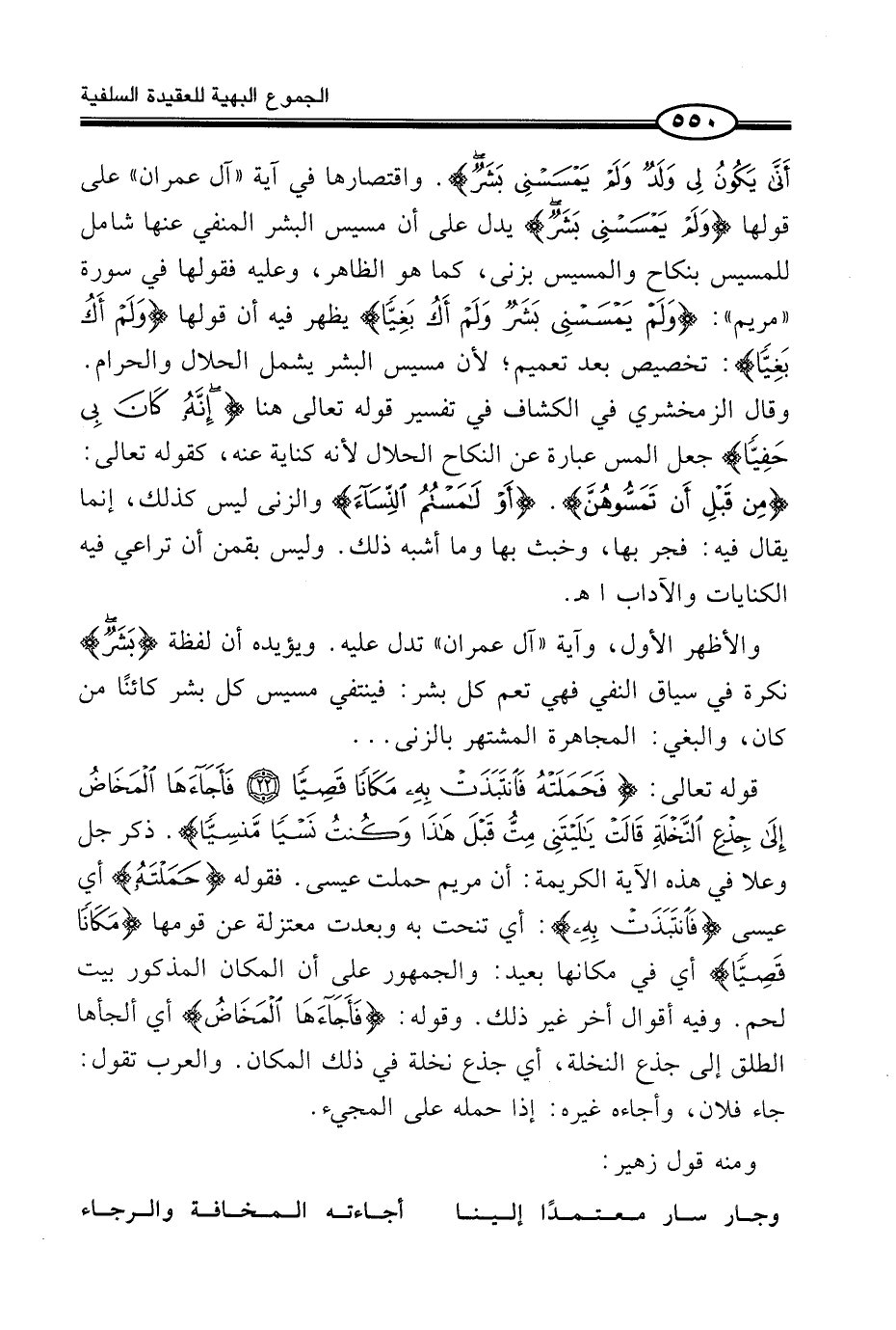 أَنَّى يَكُونُ لِى وَلَدٌ وَلَمْ يَمْسَسْنِى بَشَرٌ} . وَاقْتِصَارُهَا فِي آيَةِ «آلِ عِمْرَانَ» عَلَى قَوْلِهَا {وَلَمْ يَمْسَسْنِى بَشَرٌ} يَدُلُّ عَلَى أَنَّ مَسِيسَ الْبَشَرِ الْمَنْفِيَّ عَنْهَا شَامِلٌ لِلْمَسِيسِ بِنِكَاحٍ وَالْمَسِيسِ بِزِنًى، كَمَا هُوَ الظَّاهِرُ، وَعَلَيْهِ فَقَوْلُهَا فِي سُورَةِ «مَرْيَمَ» : {وَلَمْ يَمْسَسْنِى بَشَرٌ وَلَمْ أَكُ بَغِيّاً} يَظْهَرُ فِيهِ أَنَّ قَوْلَهَا «وَلَمْ أَكُ بَغِيًّا» : تَخْصِيصٌ بَعْدَ تَعْمِيمٍ؛ لِأَنَّ مَسِيسَ الْبَشَرِ يَشْمَلُ الْحَلَالَ وَالْحَرَامَ. وَقَالَ الزَّمَخْشَرِيُّ فِي الْكَشَّافِ فِي تَفْسِيرِ قَوْلِهِ تَعَالَى هُنَا {إِنَّهُ كَانَ بِى حَفِيّاً} جَعَلَ الْمَسَّ عِبَارَةً عَنِ النِّكَاحِ الْحَلَالِ لِأَنَّهُ كِنَايَةٌ عَنْهُ، كَقَوْلِهِ تَعَالَى: {مِن قَبْلِ أَن تَمَسُّوهُنَّ} . {أَوْ لَامَسْتُمُ النِّسَآءَ} وَالزِّنَى لَيْسَ كَذَلِكَ، إِنَّمَا يُقَالُ فِيهِ: فَجَرَ بِهَا، وَخَبُثَ بِهَا وَمَا أَشْبَهَ ذَلِكَ.