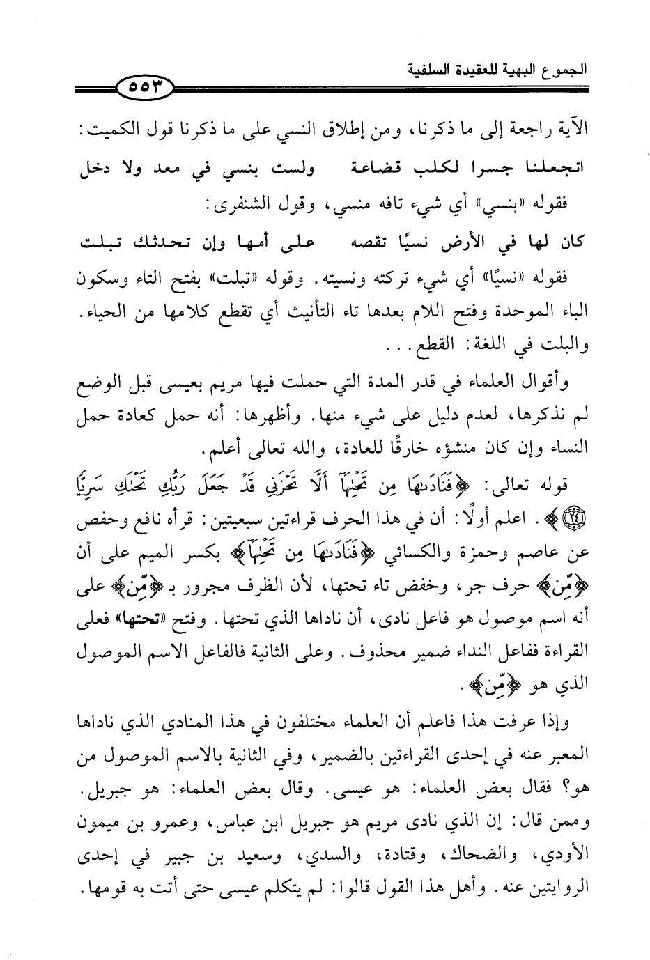 قَوْلُهُ تَعَالَى: {فَنَادَاهَا مِن تَحْتِهَآ أَلاَّ تَحْزَنِى قَدْ جَعَلَ رَبُّكِ تَحْتَكِ سَرِيّاً} . اعْلَمْ أَوَّلًا: أَنَّ فِي هَذَا الْحَرْفِ قِرَاءَتَيْنِ سَبْعِيَّتَيْنِ: قَرَأَهُ نَافِعٌ وَحَفْصٌ عَنْ عَاصِمٍ وَحَمْزَةُ وَالْكِسَائِيُّ {فَنَادَاهَا مِن تَحْتِهَآ} بِكَسْرِ الْمِيمِ عَلَى أَنَّ «مِنْ» حَرْفُ جَرٍّ، وَخَفْضِ تَاءِ تَحْتِهَا، لِأَنَّ الظَّرْفَ مَجْرُورٌ بِـ «مَنْ» عَلَى أَنَّهُ اسْمٌ مَوْصُولٌ هُوَ فَاعِلُ نَادَى، أَن نَادَاهَا الَّذِي تَحْتَهَا. وَفَتْحِ «تَحْتَهَا» فَعَلَى الْقِرَاءَةِ فَفَاعِلُ النِّدَاءِ ضَمِيرٌ مَحْذُوفٌ. وَعَلَى الثَّانِيَةِ فَالْفَاعِلُ الِاسْمُ الْمَوْصُولُ الَّذِي هُوَ «مَنْ» .