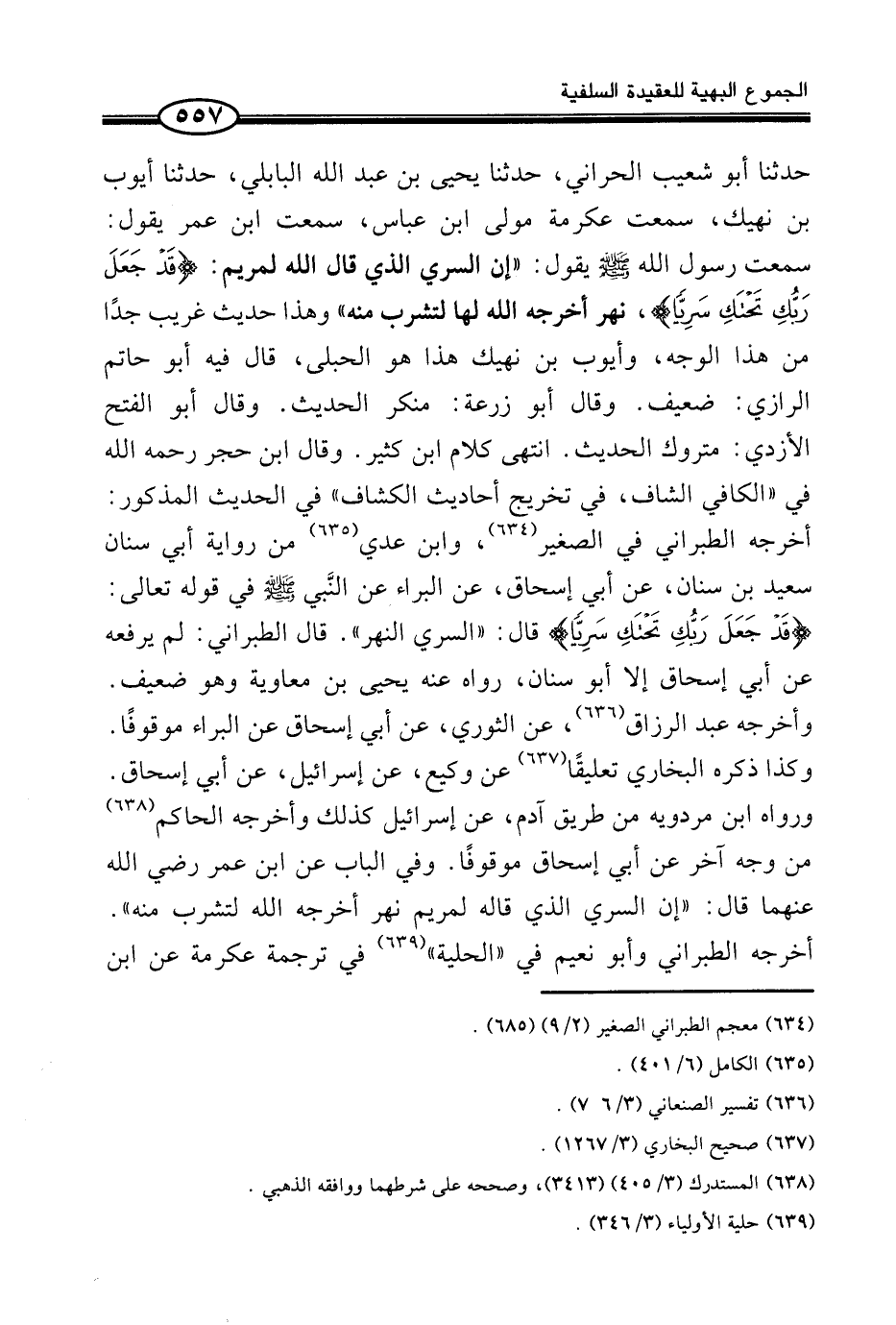 حَدَّثَنَا أَبُو شُعَيْبٍ الْحَرَّانِيُّ، حَدَّثَنَا يَحْيَى بْنُ عَبْدِ اللَّهِ الْبَابِلِيُّ، حَدَّثَنَا أَيُّوبُ بْنُ نَهِيكٍ، سَمِعْتُ عِكْرِمَةَ مَوْلَى ابْنِ عَبَّاسٍ، سَمِعْتُ ابْنَ عُمَرَ يَقُولُ: سَمِعْتُ رَسُولَ اللَّهِ صَلَّى اللَّهُ عَلَيْهِ وَسَلَّمَ يَقُولُ: «إِنَّ السَّرِيَّ الَّذِي قَالَ اللَّهُ لِمَرْيَمَ: {قَدْ جَعَلَ رَبُّكِ تَحْتَكِ سَرِيّاً} ، نَهْرٌ أَخْرَجَهُ اللَّهُ لَهَا لِتَشْرَبَ مِنْهُ» وَهَذَا حَدِيثٌ غَرِيبٌ جِدًّا مِنْ هَذَا الْوَجْهِ، وَأَيُّوبُ بْنُ نَهِيكٍ هَذَا هُوَ الْحُبُلِيُّ، قَالَ فِيهِ أَبُو حَاتِمٍ الرَّازِيُّ: ضَعِيفٌ. وَقَالَ أَبُو زُرْعَةَ: مُنْكَرُ الْحَدِيثِ. وَقَالَ أَبُو الْفَتْحِ الْأَزْدِيُّ: مَتْرُوكُ الْحَدِيثِ. انْتَهَى كَلَامُ ابْنِ كَثِيرٍ. وَقَالَ ابْنُ حجر رَحمَه الله فِي «الْكَافِي الشَّافِ، فِي تَخْرِيجِ أَحَادِيثِ الْكَشَّافِ» فِي الْحَدِيثِ الْمَذْكُورِ: أَخْرَجَهُ الطَّبَرَانِيُّ فِي الصَّغِيرِ (¬1) ، وَابْنُ عَدِيٍّ (¬2) مِنْ رِوَايَةِ أَبِي سِنَانٍ سَعِيدِ بْنِ سِنَانٍ، عَنْ أَبِي إِسْحَاقَ، عَنِ الْبَرَاءِ عَنِ النَّبي صَلَّى اللَّهُ عَلَيْهِ وَسَلَّمَ فِي قَوْلِهِ تَعَالَى: {قَدْ جَعَلَ رَبُّكِ تَحْتَكِ سَرِيّاً} قَالَ: «السَّرِيُّ النَّهْرُ» . قَالَ الطَّبَرَانِيُّ: لَمْ يَرْفَعْهُ عَنْ أَبِي إِسْحَاقَ إِلَّا أَبُو سِنَانٍ، رَوَاهُ عَنْهُ يَحْيَى بْنُ مُعَاوِيَةَ وَهُوَ ضَعِيفٌ. وَأَخْرَجَهُ عَبْدُ الرَّزَّاقِ (¬3) ، عَنِ الثَّوْرِيِّ، عَنْ أَبِي إِسْحَاقَ عَنِ الْبَرَاءِ مَوْقُوفًا. وَكَذَا ذَكَرَهُ الْبُخَارِيُّ تَعْلِيقًا (¬4) عَنْ وَكِيعٍ، عَنْ إِسْرَائِيلَ، عَنْ أَبِي إِسْحَاقَ. وَرَوَاهُ ابْنُ مَرْدَوَيْهِ مِنْ طَرِيقِ آدَمَ، عَنْ إِسْرَائِيلَ كَذَلِكَ وَأَخْرَجَهُ الْحَاكِمُ (¬5) مِنْ وَجْهٍ آخَرَ عَنْ أَبِي إِسْحَاقَ مَوْقُوفًا. وَفِي الْبَابِ عَنِ ابْنِ عُمَرَ رَضِيَ اللَّهُ عَنْهُمَا قَالَ: «إِنَّ السَّرِيَّ الَّذِي قَالَهُ لِمَرْيَمَ نَهْرٌ أَخْرَجَهُ اللَّهُ لِتَشْرَبَ مِنْهُ» .