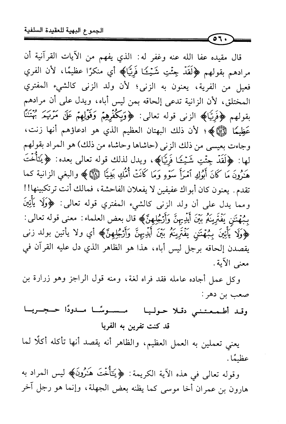 قَالَ مُقَيِّدُهُ عَفَا اللَّهُ عَنْهُ وَغَفَرَ لَهُ: الَّذِي يُفْهَمُ مِنَ الْآيَاتِ الْقُرْآنِيَّةِ أَنَّ مُرَادَهُمْ بِقَوْلِهِمْ {لَقَدْ جِئْتِ شَيْئاً فَرِيّاً} أَيْ مُنْكَرًا عَظِيمًا، لِأَنَّ الْفَرِيَّ فَعِيلٌ مِنَ الْفِرْيَةِ، يَعْنُونَ بِهِ الزِّنَى؛ لِأَنَّ وَلَدَ الزِّنَى كَالشَّيْءِ الْمُفْتَرَى الْمُخْتَلَقِ، لِأَنَّ الزَّانِيَةَ تَدَّعِي إِلْحَاقَهُ بِمَنْ لَيْسَ أَبَاهُ، وَيَدُلُّ عَلَى أَنَّ مُرَادَهُمْ بِقَوْلِهِمْ «فَرِيًّا» الزِّنَى قَوْلُهُ تَعَالَى: {وَبِكُفْرِهِمْ وَقَوْلِهِمْ عَلَى مَرْيَمَ بُهْتَاناً عَظِيماً} لِأَنَّ ذَلِكَ الْبُهْتَانَ الْعَظِيمَ الَّذِي هُوَ ادِّعَاؤُهُمْ أَنَّهَا زَنَتْ، وَجَاءَتْ بِعِيسَى مِنْ ذَلِكَ الزِّنَى (حَاشَاهَا وَحَاشَاهُ مِنْ ذَلِكَ) هُوَ الْمُرَادُ بِقَوْلِهِمْ لَهَا: {لَقَدْ جِئْتِ شَيْئاً فَرِيّاً} ، وَيدل لذَلِك قَوْله تَعَالَى بعده: {ياأُخْتَ هَارُونَ مَا كَانَ أَبُوكِ امْرَأَ سَوْءٍ وَمَا كَانَتْ أُمُّكِ بَغِيّاً} وَالْبَغِيُّ الزَّانِيَةُ كَمَا تَقَدَّمَ. يَعْنُونَ كَانَ أَبَوَاكِ عَفِيفَيْنِ لَا يَفْعَلَانِ الْفَاحِشَةَ، فمالك أَنْتِ تَرْتَكِبِينَهَا!! وَمِمَّا يَدُلُّ عَلَى أَنَّ وَلَدَ الزِّنَى كَالشَّيْءِ الْمُفْتَرَى قَوْلُهُ تَعَالَى: {وَلاَ يَأْتِينَ بِبُهُتَانٍ يَفْتَرِينَهُ بَيْنَ أَيْدِيهِنَّ وَأَرْجُلِهِنَّ} قَالَ بَعْضُ الْعُلَمَاءِ: مَعْنَى قَوْلِهِ تَعَالَى: {وَلاَ يَأْتِينَ بِبُهُتَانٍ يَفْتَرِينَهُ بَيْنَ أَيْدِيهِنَّ وَأَرْجُلِهِنَّ} أَيْ وَلَا يَأْتِينَ بِوَلَدِ زِنًى يَقْصِدْنَ إِلْحَاقَهُ بِرَجُلٍ لَيْسَ أَبَاهُ، هَذَا هُوَ الظَّاهِرُ الَّذِي دَلَّ عَلَيْهِ الْقُرْآنُ فِي مَعْنَى الْآيَةِ.