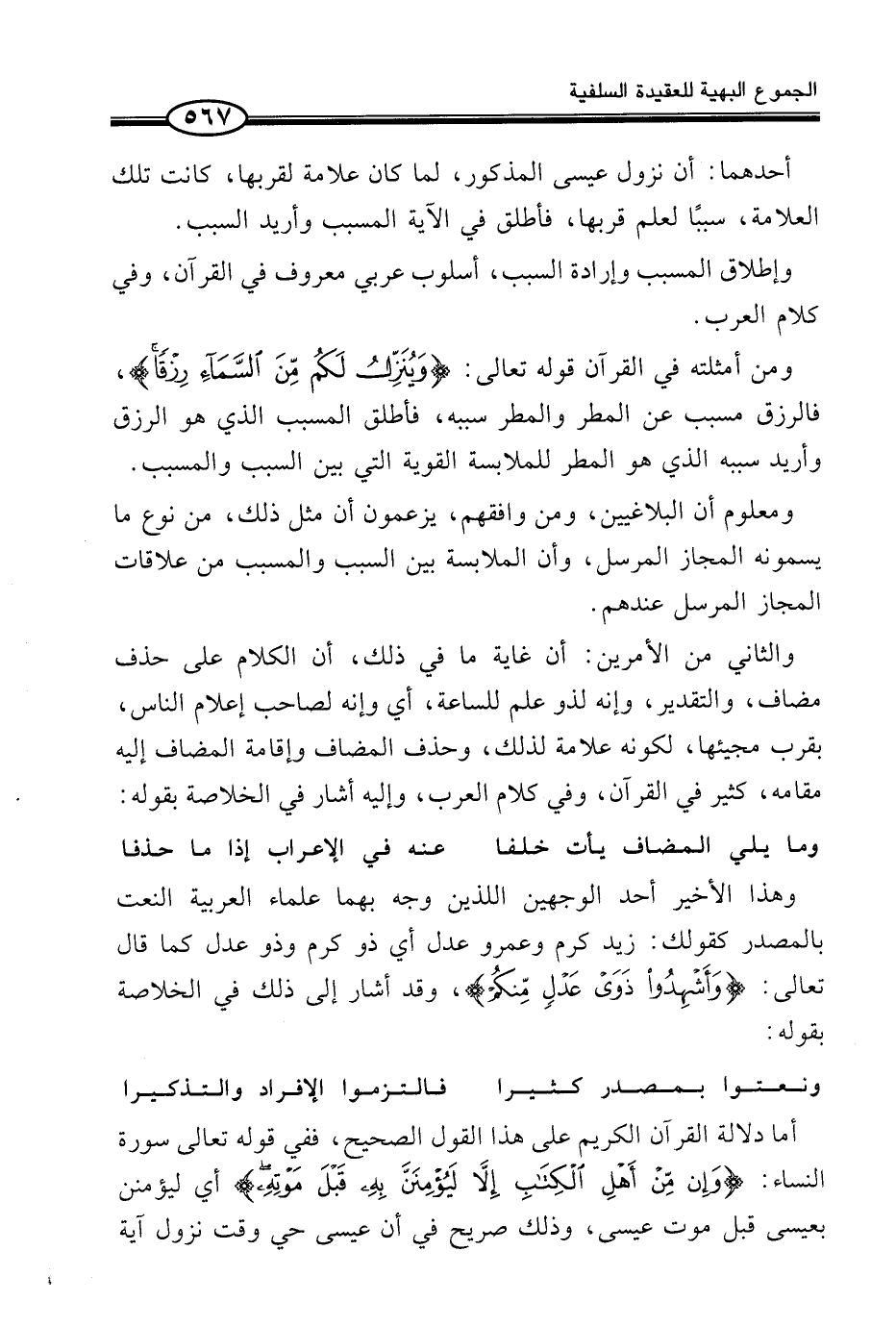 وَمَعْلُومٌ أَنَّ الْبَلَاغِيِّينَ، وَمَنْ وَافَقَهُمْ، يَزْعُمُونَ أَنَّ مِثْلَ ذَلِكَ، مِنْ نَوْعِ مَا يُسَمُّونَهُ الْمَجَازَ الْمُرْسَلَ، وَأَنَّ الْمُلَابَسَةَ بَيْنَ السَّبَبِ وَالْمُسَبَّبِ مِنْ عَلَاقَاتِ الْمَجَازِ الْمُرْسَلِ عِنْدَهُمْ.