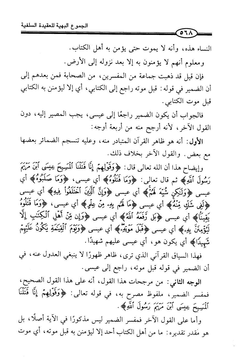 فَهَذَا السِّيَاقُ الْقُرْآنِيُّ الَّذِي تَرَى، ظَاهِرٌ ظُهُورًا لَا يَنْبَغِي الْعُدُولُ عَنْهُ، فِي أَنَّ الضَّمِيرَ فِي قَوْلِهِ قَبْلَ مَوْتِهِ، رَاجِعٌ إِلَى عِيسَى.