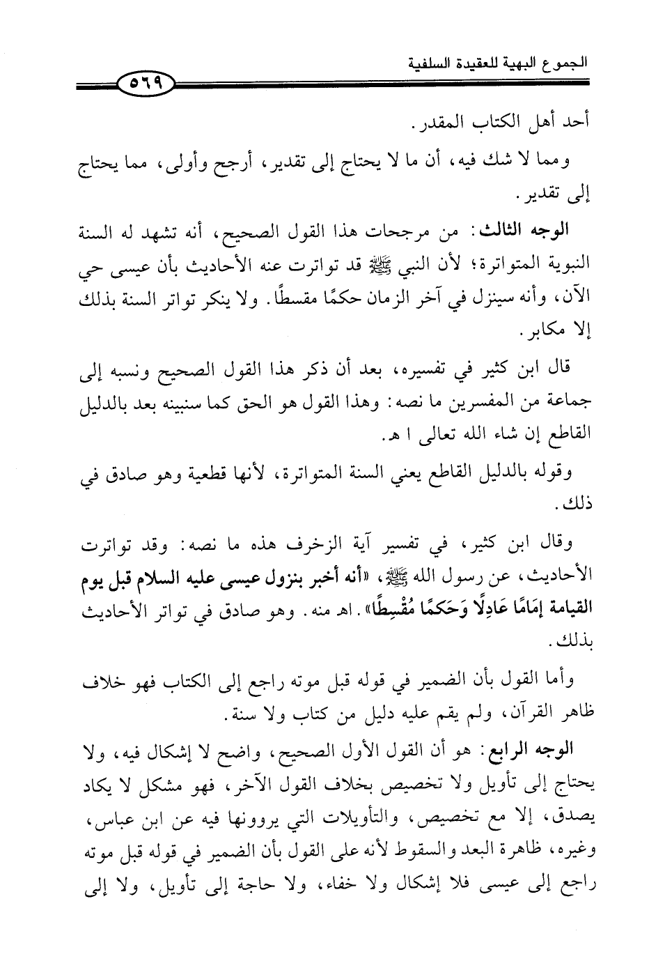 وَقَالَ ابْنُ كَثِيرٍ، فِي تَفْسِيرِ آيَةِ الزُّخْرُفِ هَذِهِ مَا نَصُّهُ: وَقَدْ تَوَاتَرَتِ الْأَحَادِيثُ، عَنْ رَسُولِ اللَّهِ صَلَّى اللَّهُ عَلَيْهِ وَسَلَّمَ، «أَنَّهُ أَخْبَرَ بِنُزُولِ عِيسَى عَلَيْهِ السَّلَامُ قَبْلَ يَوْم الْقِيَامَة إمَاماً عَادِلاً وَحَكماً مُقْسِطاً» . اهـ مِنْهُ. وَهُوَ صَادِقٌ فِي تَوَاتُرِ الْأَحَادِيثِ بِذَلِكَ.