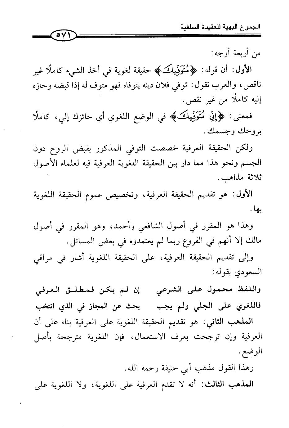 وَلَكِنَّ الْحَقِيقَةَ الْعُرْفِيَّةَ خَصَّصَتِ التَّوَفِّيَ الْمَذْكُورَ بِقَبْضِ الرُّوحِ دُونَ الْجِسْمِ وَنَحْوُ هَذَا مِمَّا دَارَ بَيْنَ الْحَقِيقَةِ اللُّغَوِيَّةِ الْعُرْفِيَّةِ فِيهِ لِعُلَمَاءِ الْأُصُولِ ثَلَاثَةُ مَذَاهِبَ.