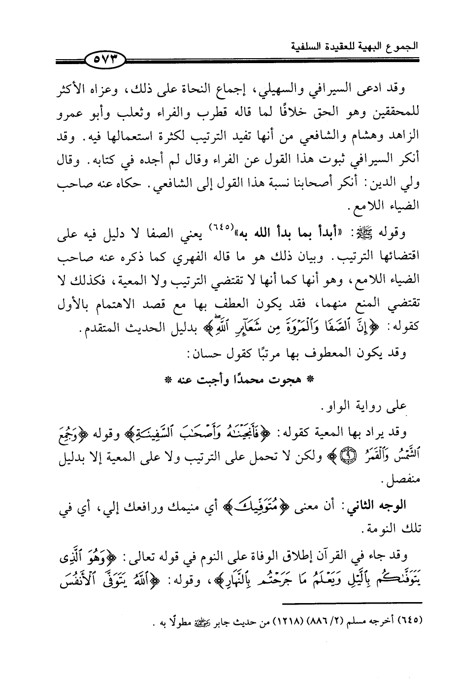 وَقَوْلُهُ صَلَّى اللَّهُ عَلَيْهِ وَسَلَّمَ: «أَبْدَأُ بِمَا بَدَأَ اللَّهُ بِهِ» (¬1) يَعْنِي الصَّفَا لَا دَلِيلَ فِيهِ عَلَى اقْتِضَائِهَا التَّرْتِيبَ. وَبَيَانُ ذَلِكَ هُوَ مَا قَالَهُ الْفِهْرَيُّ كَمَا ذَكَرَهُ عَنْهُ صَاحِبُ الضِّيَاءِ اللَّامِعِ، وَهُوَ أَنَّهَا كَمَا أَنَّهَا لَا تَقْتَضِي التَّرْتِيبَ وَلَا الْمَعِيَّةَ، فَكَذَلِكَ لَا تَقْتَضِي الْمَنْعَ مِنْهُمَا، فَقَدْ يَكُونُ الْعَطْفُ بِهَا مَعَ قَصْدِ الِاهْتِمَامِ بِالْأَوَّلِ كَقَوْلِهِ: {إِنَّ الصَّفَا وَالْمَرْوَةَ مِن شَعَآئِرِ اللَّهِ} بِدَلِيلِ الْحَدِيثِ الْمُتَقَدِّمِ.