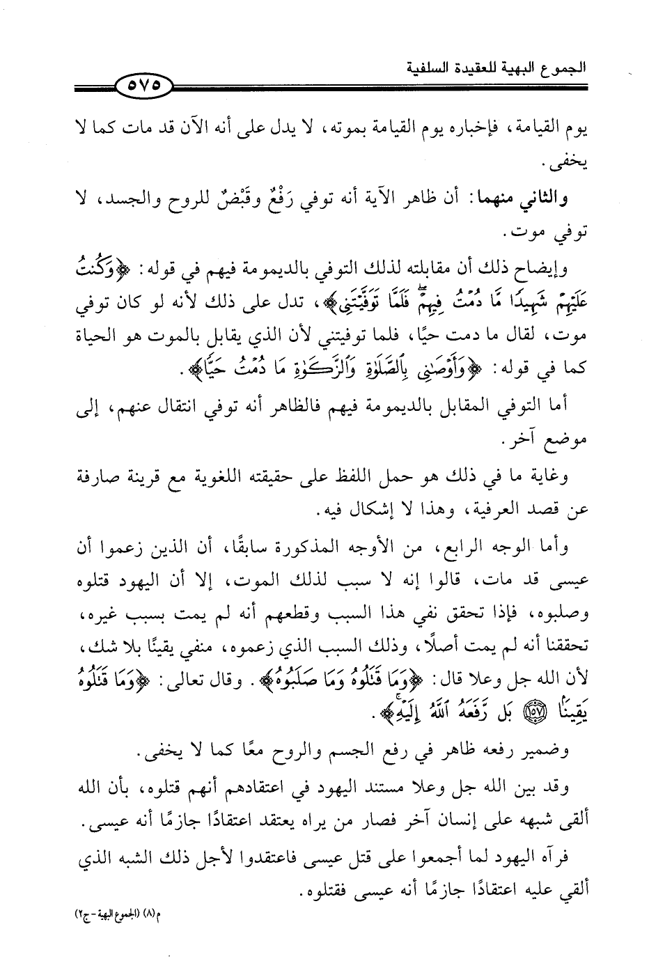 وَالثَّانِي مِنْهُمَا: أَنَّ ظَاهِرَ الْآيَةِ أَنَّهُ تَوَفِّيَ رَفْعٌ وقَبْضٌ لِلرُّوحِ وَالْجَسَدِ، لَا تَوَفِّيَ مَوْتٍ.