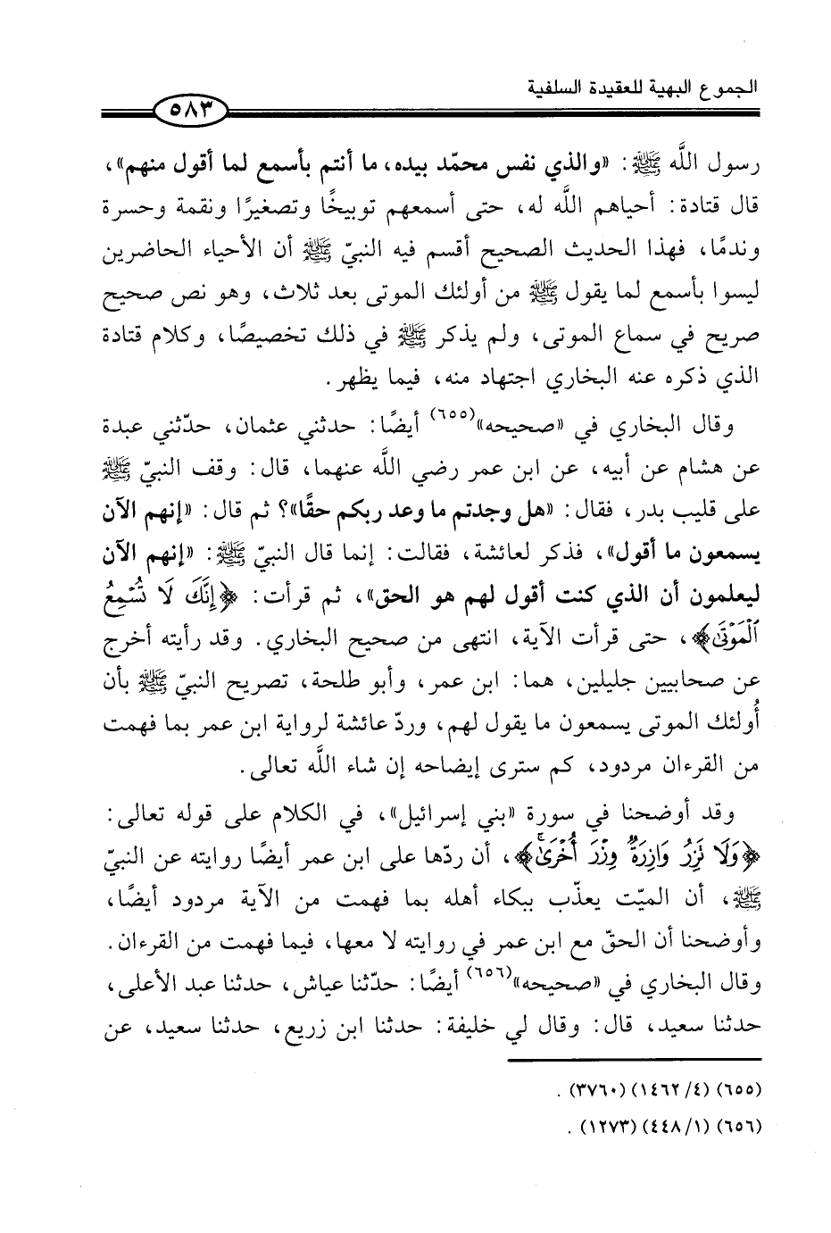 وَقَالَ الْبُخَارِيُّ فِي «صَحِيحِهِ» (¬1) أَيْضًا: حَدَّثَنِي عُثْمَانُ، حَدَّثَنِي عَبْدَةُ عَنْ هُشَامٍ عَنْ أَبِيهِ، عَنِ ابْنِ عُمَرَ رَضِيَ اللَّه عَنْهُمَا، قَالَ: وَقَفَ النَّبِيُّ صَلَّى اللَّهُ عَلَيْهِ وَسَلَّمَ عَلَى قَلِيبِ بَدْرٍ، فَقَالَ: «هَلْ وَجَدْتُمْ مَا وَعَدَ رَبُّكُمْ حَقًّا» ؟ ثُمَّ قَالَ: «إِنَّهُمُ الْآنَ يَسْمَعُونَ مَا أَقُولُ» ، فَذُكِرَ لِعَائِشَةَ، فَقَالَتْ: إِنَّمَا قَالَ النَّبِيُّ صَلَّى اللَّهُ عَلَيْهِ وَسَلَّمَ: «إِنَّهُمُ الْآنَ لَيَعْلَمُونَ أَنَّ الَّذِي كُنْتُ أَقُولُ لَهُمْ هُوَ الْحَقُّ» ، ثُمَّ قَرَأَتْ: {إِنَّكَ لاَ تُسْمِعُ الْمَوْتَى} ، حَتَّى قَرَأَتِ الْآيَةَ، انْتَهَى مِنْ صَحِيحِ الْبُخَارِيِّ. وَقَدْ رَأَيْتُهُ أَخْرَجَ عَنْ صَحَابِيَّيْنِ جَلِيلَيْنِ، هُمَا: ابْنُ عُمَرَ، وَأَبُو طَلْحَةَ، تَصْرِيحِ النَّبِيِّ صَلَّى اللَّهُ عَلَيْهِ وَسَلَّمَ بِأَنَّ أُولئك الْمَوْتَى يَسْمَعُونَ مَا يَقُولُ لَهُمْ، وَرَدُّ عَائِشَةَ لرِوَايَة ابْن عمر بِمَا فهمت من القرءان مَرْدُود، كم سَتَرَى إِيضَاحَهُ إِنْ شَاءَ اللَّه تَعَالَى.