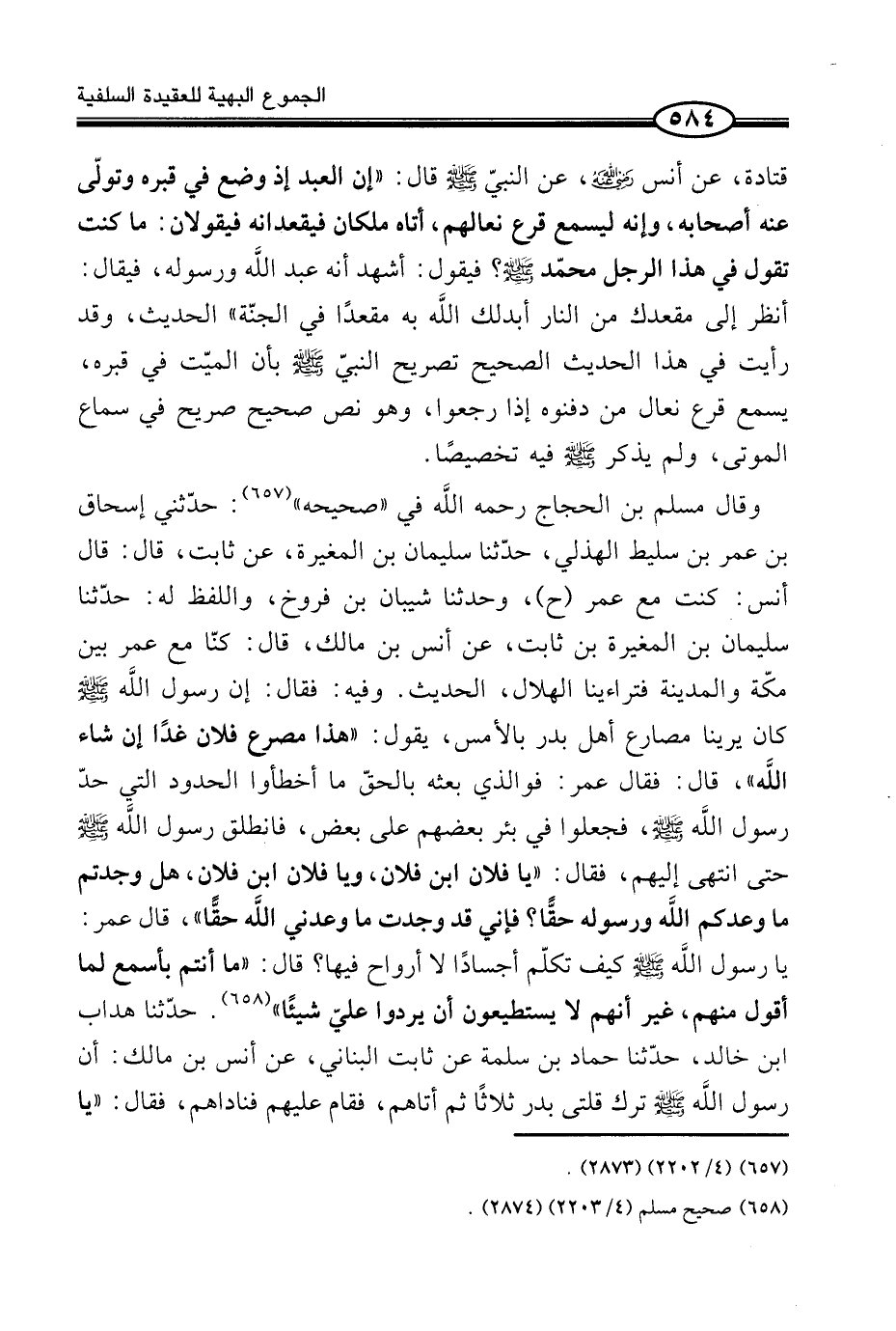 وَقَالَ مُسْلِمُ بْنُ الْحَجَّاجِ رَحِمَهُ اللَّه فِي «صَحِيحِهِ» (¬1) : حَدَّثَنِي إِسْحَاقُ بْنُ عُمَرَ بْنِ سَلِيطٍ الْهُذَلِيُّ، حَدَّثَنَا سُلَيْمَانُ بْنُ الْمُغِيرَةِ، عَنْ ثَابِتٍ، قَالَ: قَالَ أَنَسٌ: كُنْتُ مَعَ عُمَرَ (ح) ، وَحَدَّثَنَا شَيْبَانُ بْنُ فَرُّوخٍ، وَاللَّفْظُ لَهُ: حَدَّثَنَا سُلَيْمَانُ بْنُ الْمُغِيرَةِ بْنِ ثَابِتٍ، عَنْ أَنَسِ بْنِ مَالِكٍ، قَالَ: كُنَّا مَعَ عُمَرَ بَيْنَ مَكَّةَ وَالْمَدِينَةِ فَتَرَاءَيْنَا الْهِلَالَ، الْحَدِيثَ. وَفِيهِ: فَقَالَ: إِنَّ رَسُولَ اللَّه صَلَّى اللَّهُ عَلَيْهِ وَسَلَّمَ كَانَ يُرِينَا مُصَارِعَ أَهْلِ بَدْرٍ بِالْأَمْسِ، يَقُولُ: «هَذَا مَصْرَعُ فُلَانٍ غَدًا إِنْ شَاءَ اللَّه» ، قَالَ: فَقَالَ عمر: فوالذي بَعثه بالحقّ مَا أخطأوا الْحُدُودَ الَّتِي حَدَّ رَسُولُ اللَّه صَلَّى اللَّهُ عَلَيْهِ وَسَلَّمَ، فَجُعِلُوا فِي بِئْرٍ بَعْضُهُمْ عَلَى بَعْضٍ، فَانْطَلَقَ رَسُولِ اللَّه صَلَّى اللَّهُ عَلَيْهِ وَسَلَّمَ حَتَّى انْتَهَى إِلَيْهِمْ، فَقَالَ: «يَا فُلَانَ ابْن فلَان، وَيَا فلَان ابْن فُلَانٍ، هَلْ وَجَدْتُمْ مَا وَعَدَكُمُ اللَّه وَرَسُولُهُ حَقًّا؟ فَإِنِّي قَدْ وَجَدْتُ مَا وَعَدَنِي اللَّه حَقًّا» ، قَالَ عُمَرُ: يَا رَسُولَ اللَّه صَلَّى اللَّهُ عَلَيْهِ وَسَلَّمَ كَيْفَ تُكَلِّمُ أَجْسَادًا لَا أَرْوَاحَ فِيهَا؟ قَالَ: «مَا أَنْتُمْ بِأَسْمَعَ لِمَا أَقُولُ مِنْهُمْ، غَيْرَ أَنَّهُمْ لَا يَسْتَطِيعُونَ أَنْ يَرُدُّوا عَلَيَّ شَيْئًا» . حَدَّثَنَا (¬2) هَدَّابُ بْنُ خَالِدٍ، حَدَّثَنَا حَمَّادُ بْنُ سَلَمَةَ عَنْ ثَابِتٍ الْبُنَانِيِّ، عَنْ أَنَسِ بْنِ مَالِكٍ: أَنَّ رَسُولَ اللَّه صَلَّى اللَّهُ عَلَيْهِ وَسَلَّمَ ترك قلتى بَدْرٍ ثَلَاثًا ثُمَّ أَتَاهُمْ، فَقَامَ عَلَيْهِمْ فَنَادَاهُمْ، فَقَالَ: «يَا