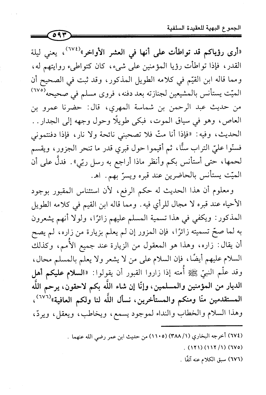 «أَرَى رُؤْيَاكُمْ قَدْ تَوَاطَأَتْ عَلَى أَنَّهَا فِي الْعَشْرِ الْأَوَاخِرِ» (¬1) ، يَعْنِي لَيْلَةَ الْقَدْرِ، فَإِذَا تَوَاطَأَتْ رُؤْيا الْمُؤمنِينَ على شىء، كَانَ كتواطىء رِوَايَتِهِمْ لَهُ، وَمِمَّا قَالَهُ ابْنُ الْقَيِّمِ فِي كَلَامِهِ الطَّوِيلِ الْمَذْكُورِ، وَقَدْ ثَبَتَ فِي الصَّحِيحِ أَنَّ الْمَيِّتَ يَسْتَأْنِسُ بِالْمُشَيِّعِينَ لِجِنَازَتِهِ بَعْدَ دَفْنِهِ، فَرَوَى مُسْلِمٌ فِي صَحِيحِهِ (¬2) مِنْ حَدِيثِ عَبْدِ الرَّحْمَنِ بْنِ شَمَّاسَةَ الْمَهْرِيِّ، قَالَ: حَضَرْنَا عَمْرَو بْنَ الْعَاصِ، وَهُوَ فِي سِيَاقِ الْمَوْتِ، فَبَكَى طَوِيلًا وَحَوَّلَ وَجْهَهُ إِلَى الْجِدَارِ.. الْحَدِيثَ، وَفِيهِ: فَإِذَا أَنَا مُتُّ فَلَا تَصْحَبْنِي نَائِحَةٌ وَلَا نَارٌ، فَإِذَا دَفَنْتُمُونِي فَسُنُّوا عَلَيَّ التُّرَابَ سَنًّا، ثُمَّ أَقِيمُوا حَوْلَ قَبْرِي قَدْرَ مَا تُنْحَرُ الْجَزُورُ، وَيُقَسَّمُ لَحْمُهَا، حَتَّى أَسْتَأْنِسَ بِكُمْ وَأَنْظُرَ مَاذَا أُرَاجِعُ بِهِ رُسُلَ رَبِّي، فدلَّ عَلَى أَنَّ الْمَيِّتَ يَسْتَأْنِسُ بِالْحَاضِرِينَ عِنْدَ قَبْرِهِ وَيُسَرُّ بهم، اهـ.