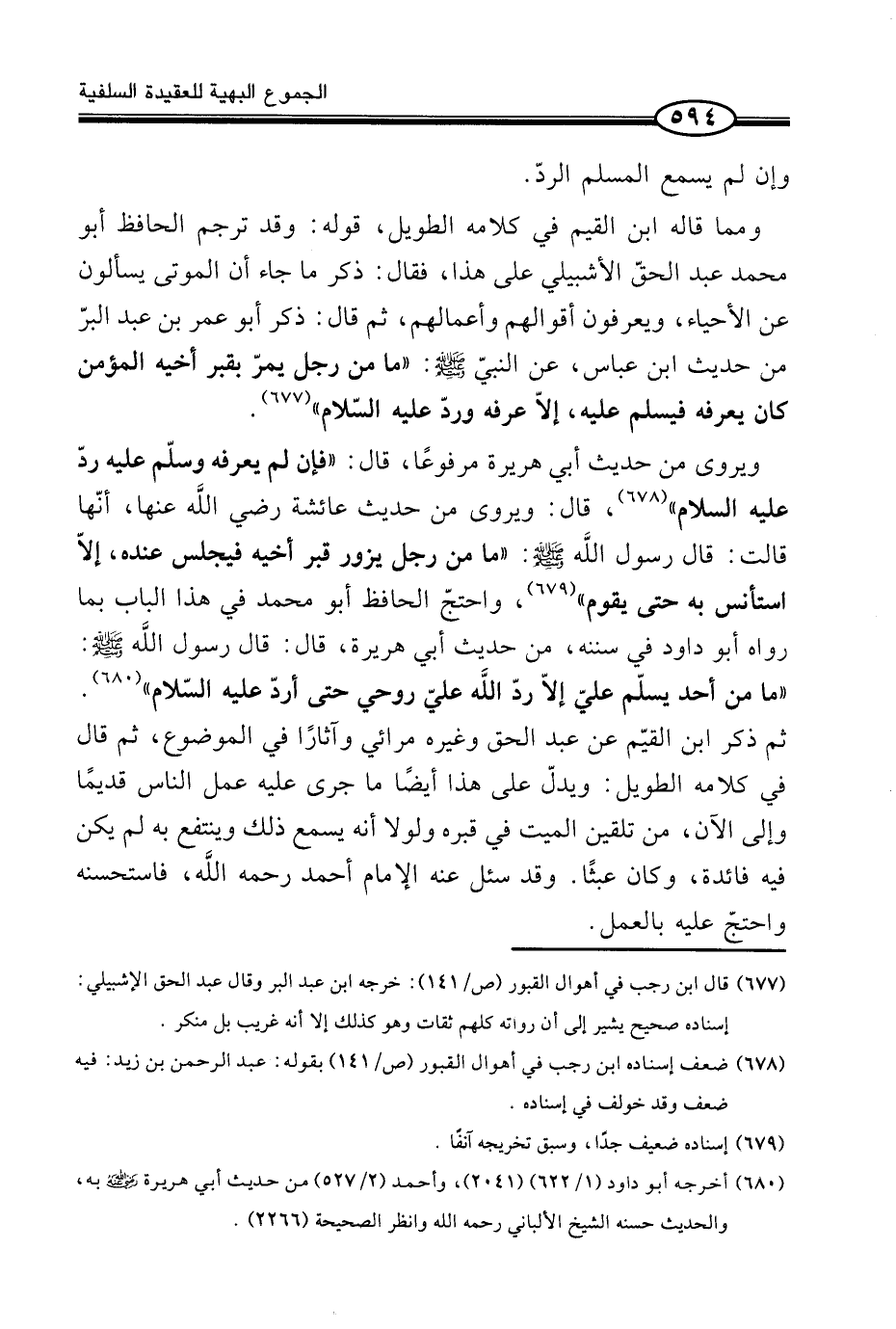 وَمِمَّا قَالَهُ ابْنُ الْقِيَمِ فِي كَلَامِهِ الطَّوِيلِ، قَوْلُهُ: وَقَدْ تَرْجَمَ الْحَافِظُ أَبُو مُحَمَّدٍ عَبْدُ الْحَقِّ الْأَشْبِيلِيُّ عَلَى هَذَا، فَقَالَ: ذِكْرُ مَا جَاءَ أَنَّ الْمَوْتَى يُسْأَلُونَ عَنِ الْأَحْيَاءِ، وَيَعْرِفُونَ أَقْوَالَهُمْ وَأَعْمَالَهُمْ، ثُمَّ قَالَ: ذَكَرَ أَبُو عُمَرَ بْنُ عَبْدِ الْبَرِّ مِنْ حَدِيثِ ابْنِ عَبَّاسٍ، عَنِ النَّبِيِّ صَلَّى اللَّهُ عَلَيْهِ وَسَلَّمَ: «مَا مِنْ رَجُلٍ يَمُرُّ بِقَبْرِ أَخِيهِ الْمُؤْمِنِ كَانَ يَعْرِفُهُ فَيُسَلِّمُ عَلَيْهِ، إِلَّا عَرَفَهُ وَرَدَّ عَلَيْهِ السَّلَامَ» (¬1) .