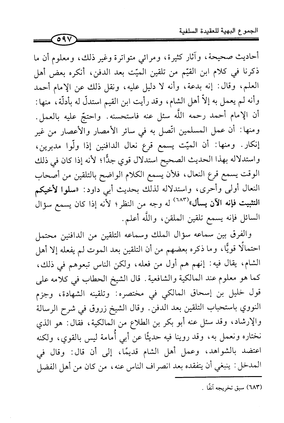 أَحَادِيثُ صَحِيحَةٌ، وَآثَارٌ كَثِيرَةٌ، وَمَرَائِي مُتَوَاتِرَةٌ وَغَيْرُ ذَلِكَ، وَمَعْلُومٌ أَنَّ مَا ذَكَرْنَا فِي كَلَامِ ابْنِ الْقَيِّمِ مِنْ تَلْقِينِ الْمَيِّتِ بَعْدَ الدَّفْنِ، أَنْكَرَهُ بَعْضُ أَهْلِ الْعِلْمِ، وَقَالَ: إِنَّهُ بِدْعَةٌ، وَأَنَّهُ لَا دَلِيلَ عَلَيْهِ، وَنُقِلَ ذَلِكَ عَنِ الْإِمَامِ أَحْمَدَ وَأَنَّهُ لَمْ يَعْمَلْ بِهِ إِلَّا أَهْلُ الشَّامِ، وَقَدْ رَأَيْتَ ابْنَ الْقَيِّمِ اسْتَدَلَّ لَهُ بِأَدِلَّةٍ، مِنْهَا: أَنَّ الْإِمَامَ أَحْمَدَ رَحِمَهُ اللَّه سُئِلَ عَنْهُ فَاسْتَحْسَنَهُ. وَاحْتَجَّ عَلَيْهِ بِالْعَمَلِ. وَمِنْهَا: أَنَّ عَمَلَ الْمُسْلِمِينَ اتَّصَلَ بِهِ فِي سَائِرِ الْأَمْصَارِ وَالْأَعْصَارِ مِنْ غَيْرِ إِنْكَارٍ. وَمِنْهَا: أَنَّ الْمَيِّتَ يَسْمَعُ قَرْعَ نِعَالِ الدَّافِنِينَ إِذَا وَلَّوْا مُدْبِرِينَ، وَاسْتِدْلَالُهُ بِهَذَا الْحَدِيثِ الصَّحِيحِ اسْتِدْلَالٌ قَوِيٌّ جِدًّا؛ لِأَنَّهُ إِذَا كَانَ فِي ذَلِكَ الْوَقْتِ يَسْمَعُ قَرْعَ النِّعَالِ، فَلَأَنْ يَسْمَعُ الْكَلَامَ الْوَاضِحَ بِالتَّلْقِينِ مِنْ أَصْحَابِ النِّعَالِ أَوْلَى وَأَحْرَى، وَاسْتِدْلَالُهُ لِذَلِكَ بِحَدِيثِ أَبِي دَاوُدَ: «سَلُوا لِأَخِيكُمُ التَّثْبِيتَ فَإِنَّهُ الْآنَ يُسْأَلُ» (¬1) لَهُ وَجْهٌ مِنَ النَّظَرِ؛ لِأَنَّهُ إِذَا كَانَ يَسْمَعُ سُؤَالَ السَّائِلِ فَإِنَّهُ يَسْمَعُ تَلْقِينَ الْمُلَقِّنِ، واللَّه أَعْلَمُ.