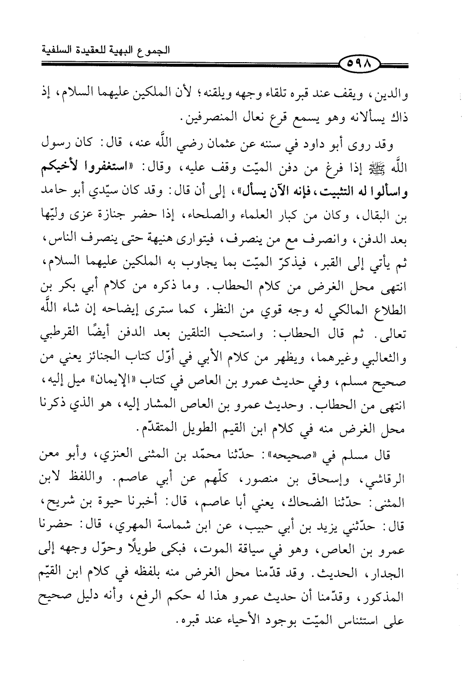 وَقَدْ رَوَى أَبُو دَاوُدَ فِي سُنَنِهِ عَنْ عُثْمَانَ رَضِيَ اللَّه عَنْهُ، قَالَ: كَانَ رَسُولُ اللَّه صَلَّى اللَّهُ عَلَيْهِ وَسَلَّمَ إِذَا فَرَغَ مِنْ دَفْنِ الْمَيِّتِ وَقَفَ عَلَيْهِ، وَقَالَ: «اسْتَغْفِرُوا لِأَخِيكُمْ وَاسْأَلُوا لَهُ التَّثْبِيتَ، فَإِنَّهُ الْآنَ يُسْأَلُ» ، إِلَى أَنْ قَالَ: وَقَدْ كَانَ سَيِّدِي أَبُو حَامِدِ بْنُ الْبَقَّالِ، وَكَانَ مِنْ كِبَارِ الْعُلَمَاءِ وَالصُّلَحَاءِ، إِذَا حَضَرَ جِنَازَةً عَزَّى وَلَيَّهَا بَعْدَ الدَّفْنِ، وَانْصَرَفَ مَعَ مَنْ يَنْصَرِفُ، فَيَتَوَارَى هُنَيْهَةً حَتَّى يَنْصَرِفَ النَّاسُ، ثُمَّ يَأْتِي إِلَى الْقَبْرِ، فَيُذَكِّرُ الْمَيِّتَ بِمَا يُجَاوِبُ بِهِ الْمَلَكَيْنِ عَلَيْهِمَا السَّلَامُ، انْتَهَى مَحَلُّ الْغَرَضِ مِنْ كَلَامِ الْحَطَّابِ. وَمَا ذَكَرَهُ مِنْ كَلَامِ أَبِي بَكْرِ بْنِ الطِّلَاعِ الْمَالِكِيِّ لَهُ وَجْهٌ قَوِيٌّ مِنَ النَّظَرِ، كَمَا سَتَرَى إِيضَاحَهُ إِنْ شَاءَ اللَّه تَعَالَى. ثُمَّ قَالَ الْحَطَّابُ: وَاسْتَحَبَّ التَّلْقِينَ بَعْدَ الدَّفْنِ أَيْضًا الْقُرْطُبِيُّ والثعالبي وَغَيرهمَا، وَيظْهر من كَلَام الأبي فِي أَوَّلِ كِتَابِ الْجَنَائِزِ يَعْنِي مِنْ صَحِيحِ مُسْلِمٍ، وَفِي حَدِيثِ عَمْرِو بْنِ الْعَاصِ فِي كِتَابِ «الْإِيمَانِ» مَيْلٌ إِلَيْهِ، انْتَهَى مِنَ الْحَطَّابِ. وَحَدِيثُ عَمْرِو بْنِ الْعَاصِ الْمُشَارُ إِلَيْهِ، هُوَ الَّذِي ذَكَرْنَا مَحَلَّ الْغَرَضِ مِنْهُ فِي كَلَامِ ابْنِ الْقَيِّمِ الطَّوِيلِ الْمُتَقَدِّمِ.