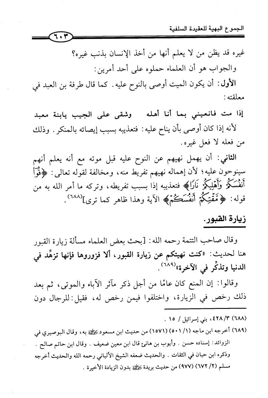 الثَّانِي: أَنْ يَهْمِلَ نَهْيَهُمْ عَنِ النَّوْحِ عَلَيْهِ قَبْلَ مَوْتِهِ مَعَ أَنَّهُ يَعْلَمُ أَنَّهُمْ سَيَنُوحُونَ عَلَيْهِ؛ لِأَنَّ إِهْمَالَهُ نَهْيَهُمْ تَفْرِيطٌ مِنْهُ، وَمُخَالَفَةٌ لِقَوْلِهِ تَعَالَى: {قُواْ أَنفُسَكُمْ وَأَهْلِيكُمْ نَاراً} فَتَعْذِيبُهُ إِذًا بِسَبَبِ تَفْرِيطِهِ، وَتَرْكِهِ مَا أَمَرَ اللَّهُ بِهِ من قَوْله: {مَّقْتِكُمْ أَنفُسَكُمْ} الْآيَة وَهَذَا ظَاهر كَمَا ترى.] (¬1) .