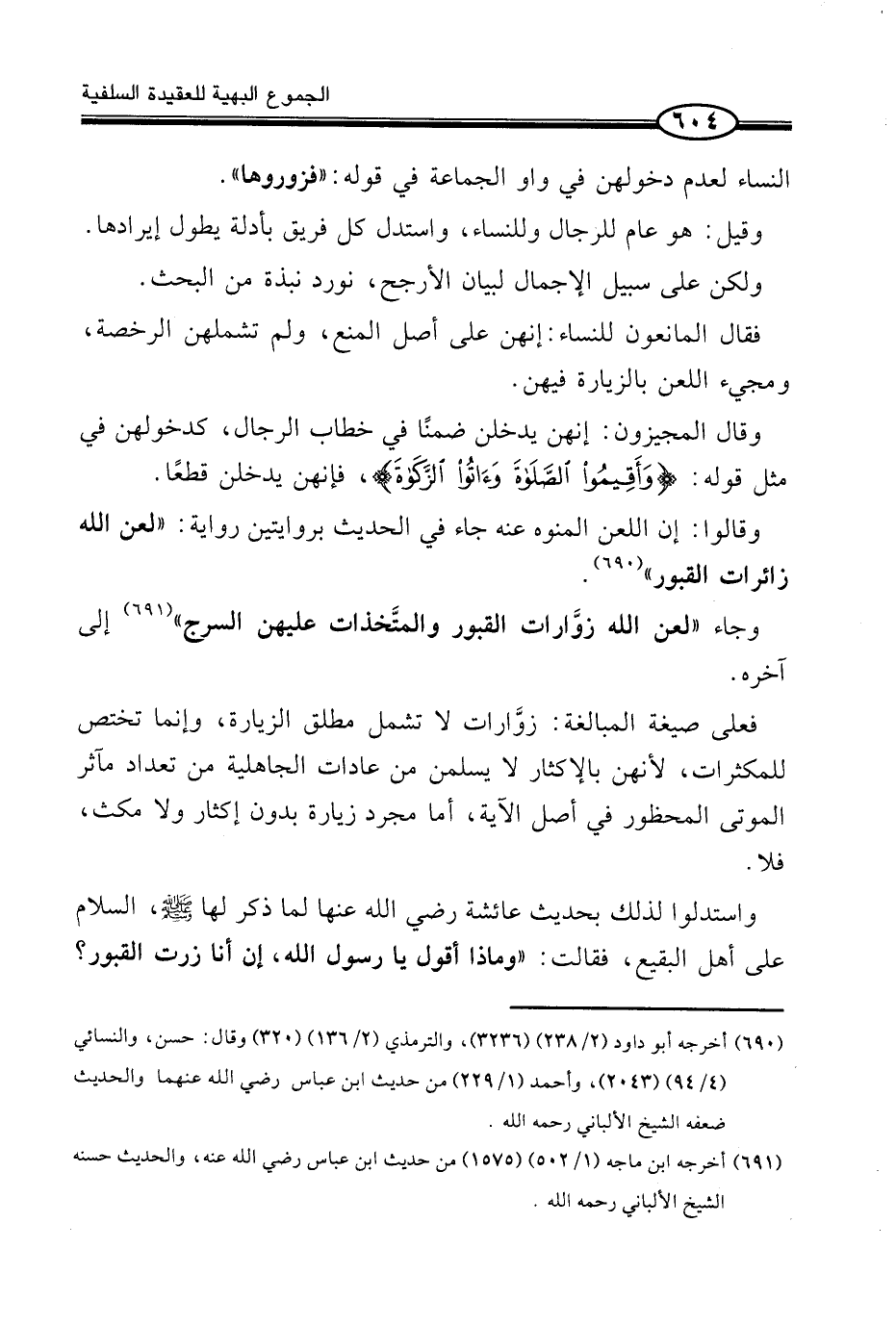 وَقَالُوا: إِنَّ اللَّعْنَ الْمُنَوَّهَ عَنْهُ جَاءَ فِي الْحَدِيثِ بِرِوَايَتَيْنِ رِوَايَةِ: «لَعَنَ اللَّهُ زَائِرَاتِ الْقُبُورِ» (¬1) .