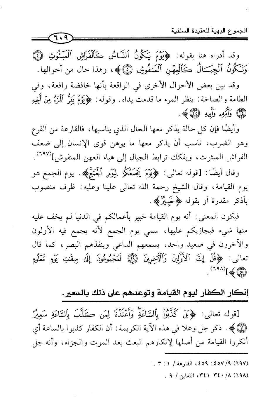 وَأَيْضًا فَإِنَّ كُلَّ حَالَةٍ يَذْكُرُ مَعَهَا الْحَالَ الَّذِي يُنَاسِبُهَا، فَالْقَارِعَةُ مِنَ الْقَرْعِ وَهُوَ الضَّرْبُ، نَاسَبَ أَنْ يَذْكُرَ مَعَهَا مَا يُوهِنُ قُوَى الْإِنْسَانِ إِلَى ضِعْفِ الْفَرَاشِ الْمَبْثُوثِ، وَيُفَكِّكُ ترابط الْجبَال إِلَى هباء العهن المنفوش.] (¬1) .