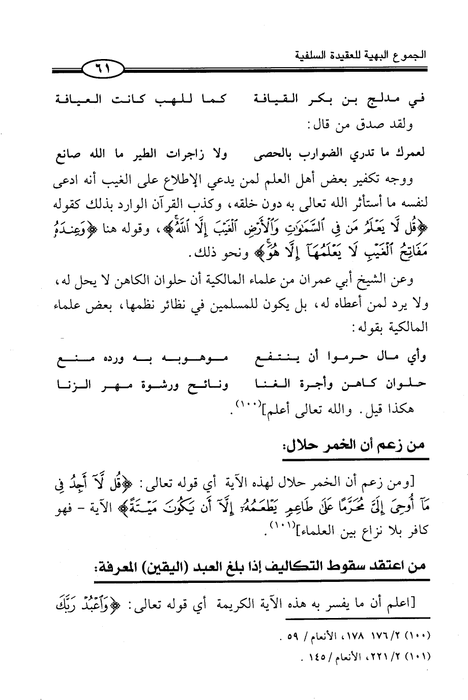 [وَمَنْ زَعَمَ أَنَّ الْخَمْرَ حَلَالٌ لِهَذِهِ الْآيَةِ - أَي قَوْلِهِ تَعَالَى: (قُلْ لَا أَجِدُ فِي مَا أُوحِيَ إِلَيَّ مُحَرَّماً عَلَى طَاعِمٍ يَطْعَمُهُ إِلَّا أَنْ يَكُونَ مَيْتَةً) الْآيَةِ - فَهُوَ كَافِرٌ بِلَا نِزَاعٍ بَيْنَ الْعُلَمَاءِ] (¬2) .