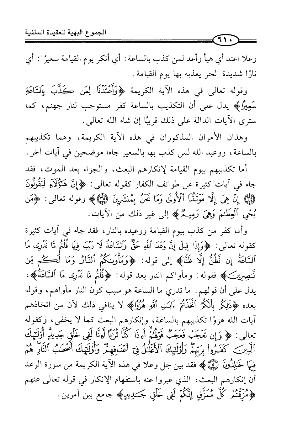 وَأَمَّا كُفْرُ مَنْ كَذَّبَ بِيَوْمِ الْقِيَامَةِ وَوَعِيدِهِ بِالنَّارِ، فَقَدْ جَاءَ فِي آيَاتٍ كَثِيرَةٍ كَقَوْلِهِ تَعَالَى: {وَإِذَا قِيلَ إِنَّ وعْدَ اللَّهِ حَقٌّ وَالسَّاعَةُ لاَ رَيْبَ فِيهَا قُلْتُم مَّا نَدْرِى مَا السَّاعَةُ إِن نَّظُنُّ إِلاَّ ظَنّاً} إِلَى قَوْلِهِ: {وَمَأْوَاكُمُ النَّارُ وَمَا لَكُمْ مِنْ نَّاصِرِينَ} فَقَوْلُهُ: وَمَأْوَاكُمُ النَّارُ بَعْدَ قَوْلِهِ: {قُلْتُم مَّا نَدْرِى مَا السَّاعَةُ} ، يدل على أَن قَوْلهم: مَا تَدْرِي مَا السَّاعَةُ هُوَ سَبَبُ كَوْنِ النَّارِ مَأْوَاهُمْ، وَقَوْلُهُ بَعْدَهُ {ذَلِكُم بِأَنَّكُمُ اتَّخَذْتُمْ آيَاتِ اللَّهِ هُزُواً} لَا يُنَافِي ذَلِكَ لِأَنَّ مِنِ اتِّخَاذِهِمْ آيَاتِ اللَّهِ هُزُوًا تَكْذِيبَهُمْ بِالسَّاعَةِ، وَإِنْكَارَهُمُ الْبَعْثَ كَمَا لَا يَخْفَى، وَكَقَوْلِهِ تَعَالَى: {وَإِن تَعْجَبْ فَعَجَبٌ قَوْلُهُمْ أَءذَا كُنَّا تُرَابًا أَءنَّا لَفِى خَلْقٍ جَدِيدٍ أُوْلَئِكَ الَّذِينَ كَفَرُواْ بِرَبّهِمْ وَأُوْلَئِكَ الاْغْلَالُ فِى أَعْنَاقِهِمْ وَأُوْلَئِكَ أَصْحَابُ النَّارِ هُمْ فِيهَا خَالِدونَ} فَقَدْ بَيَّنَ جَلَّ وَعَلَا فِي هَذِهِ الْآيَةِ الْكَرِيمَةِ مِنْ سُورَةِ الرَّعْدِ أَنَّ إِنْكَارَهُمُ الْبَعْثَ، الَّذِي عَبَّرُوا عَنْهُ بِاسْتِفْهَامِ الْإِنْكَار فِي قَوْله تَعَالَى عَنْهُم {مُزّقْتُمْ كُلَّ مُمَزَّقٍ إِنَّكُمْ لَفِى خَلْقٍ جَدِيدٍ} جَامِعٌ بَيْنَ أَمْرَيْنِ.