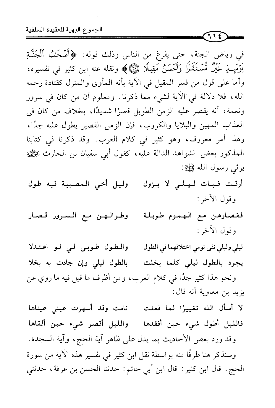 فِي رِيَاضِ الْجَنَّةِ، حَتَّى يُفْرَغَ مِنَ النَّاسِ وَذَلِكَ قَوْلُهُ: {أَصْحَابُ الْجَنَّةِ يَوْمَئِذٍ خَيْرٌ مُّسْتَقَرّاً وَأَحْسَنُ مَقِيلاً} وَنَقَلَهُ عَنْهُ ابْنُ كَثِيرٍ فِي تَفْسِيرِهِ، وَأَمَّا عَلَى قَوْلِ مَنْ فَسَّرَ الْمَقِيلَ فِي الْآيَةِ بِأَنَّهُ الْمَأْوَى وَالْمَنْزِلُ كَقَتَادَةَ رَحِمَهُ اللَّهُ، فَلَا دَلَالَةَ فِي الْآيَةِ لِشَيْءٍ مِمَّا ذَكَرْنَا. وَمَعْلُومٌ أَنَّ مَنْ كَانَ فِي سُرُورٍ وَنِعْمَةٍ، أَنَّهُ يَقْصُرُ عَلَيْهِ الزَّمَنُ الطَّوِيلُ قَصْرًا شَدِيدًا، بِخِلَافِ مَنْ كَانَ فِي الْعَذَابِ الْمُهِينِ وَالْبَلَايَا وَالْكُرُوبِ، فَإِنَّ الزَّمَنَ الْقَصِيرَ يَطُولُ عَلَيْهِ جِدًّا، وَهَذَا أَمْرٌ مَعْرُوفٌ، وَهُوَ كَثِيرٌ فِي كَلَامِ الْعَرَبِ. وَقَدْ ذَكَرْنَا فِي كِتَابِنَا الْمَذْكُورِ بَعْضَ الشَّوَاهِدِ الدَّالَّةِ عَلَيْهِ، كَقَوْلِ أَبِي سُفْيَانَ بْنِ الْحَارِثِ رَضِيَ اللَّهُ عَنْهُ يَرْثِي رَسُولَ اللَّهِ صَلَّى اللَّهُ عَلَيْهِ وَسَلَّمَ: