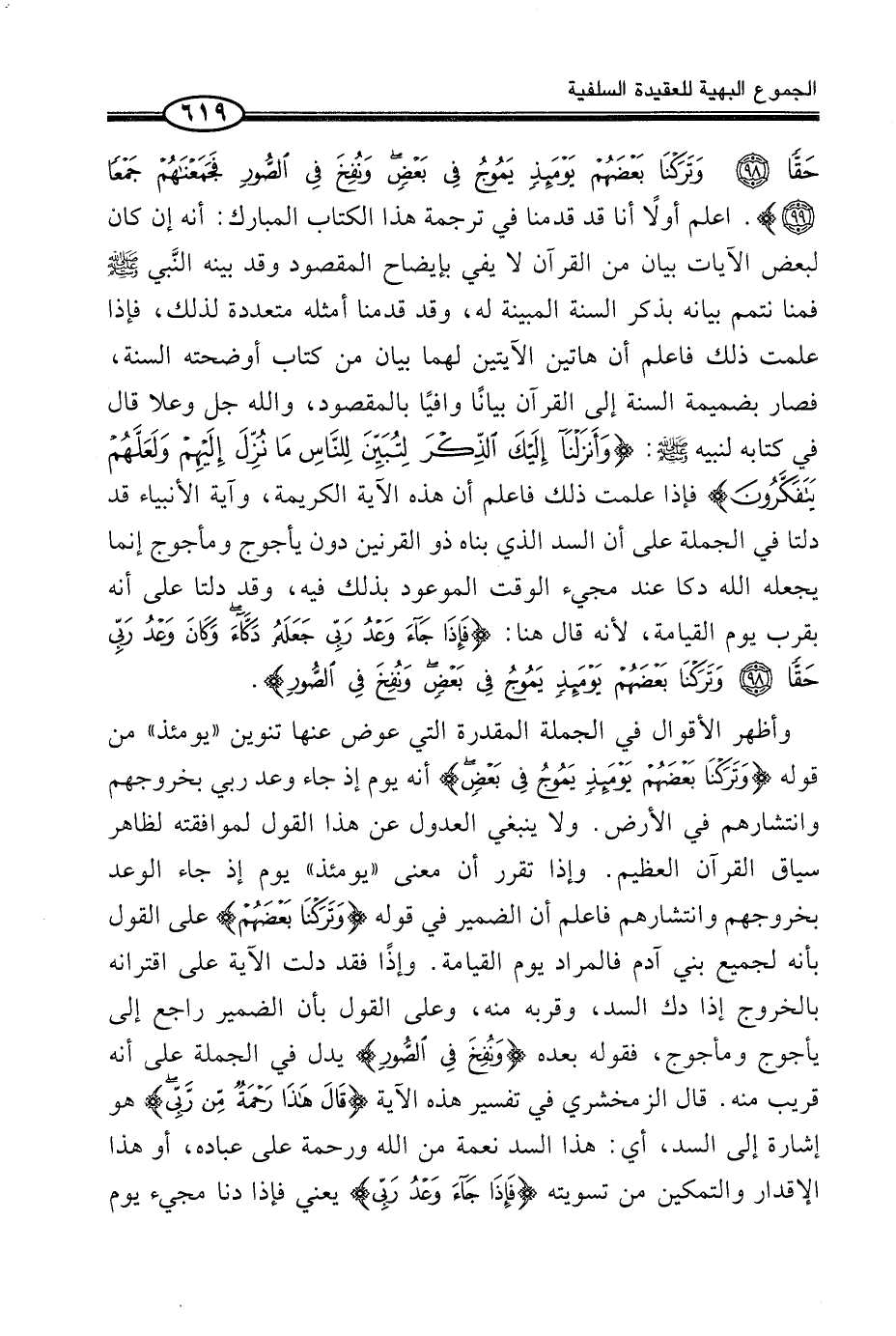 وَأَظْهَرُ الْأَقْوَالِ فِي الْجُمْلَةِ الْمُقَدَّرَةِ الَّتِي عَوَّضَ عَنْهَا تَنْوِينُ «يَوْمَئِذٍ» مِنْ قَوْلِهِ {وَتَرَكْنَا بَعْضَهُمْ يَوْمَئِذٍ يَمُوجُ فِى بَعْضٍ} أَنَّهُ يَوْمَ إِذْ جَاءَ وَعْدُ رَبِّي بِخُرُوجِهِمْ وَانْتِشَارِهِمْ فِي الْأَرْضِ. وَلَا يَنْبَغِي الْعُدُولُ عَنْ هَذَا الْقَوْلِ لِمُوَافَقَتِهِ لِظَاهِرِ سِيَاقٍ الْقُرْآنِ الْعَظِيمِ. وَإِذَا تَقَرَّرَ أَنَّ مَعْنَى «يَوْمَئِذٍ» يَوْمَ إِذْ جَاءَ الْوَعْدُ بِخُرُوجِهِمْ وَانْتِشَارِهِمْ فَاعْلَمْ أَنَّ الضَّمِيرَ فِي قَوْلِهِ {وَتَرَكْنَا بَعْضَهُمْ} عَلَى الْقَوْلِ بِأَنَّهُ لِجَمِيعِ بَنِي آدَمَ فَالْمُرَادُ يَوْمُ الْقِيَامَةِ. وَإِذًا فَقَدْ دَلَّتِ الْآيَةُ عَلَى اقْتِرَانِهِ بِالْخُرُوجِ إِذَا دَكَّ السَّدَّ، وَقَرَّبَهُ مِنْهُ، وَعَلَى الْقَوْلِ بِأَنَّ الضَّمِيرَ رَاجِعٌ إِلَى يَأْجُوجَ وَمَأْجُوجَ، فَقَوْلُهُ بَعْدَهُ {وَنُفِخَ فِى الصُّورِ} يَدُلُّ فِي الْجُمْلَةِ عَلَى أَنَّهُ قَرِيبٌ مِنْهُ. قَالَ الزَّمَخْشَرِيُّ فِي تَفْسِيرِ هَذِهِ الْآيَةِ «قَالَ هَذَا رَحْمَةٌ مِنْ رَبِّي» هُوَ إِشَارَةٌ إِلَى السَّدِّ، أَيْ: هَذَا السَّدُّ نِعْمَةٌ مِنَ اللَّهِ وَرَحْمَةٌ عَلَى عِبَادِهِ، أَوْ هَذَا الْإِقْدَارٌ وَالتَّمْكِينٌ مِنْ تَسْوِيَتِهِ {فَإِذَا جَآءَ وَعْدُ رَبِّى} يَعْنِي فَإِذَا دَنَا مَجِيءُ يَوْمِ