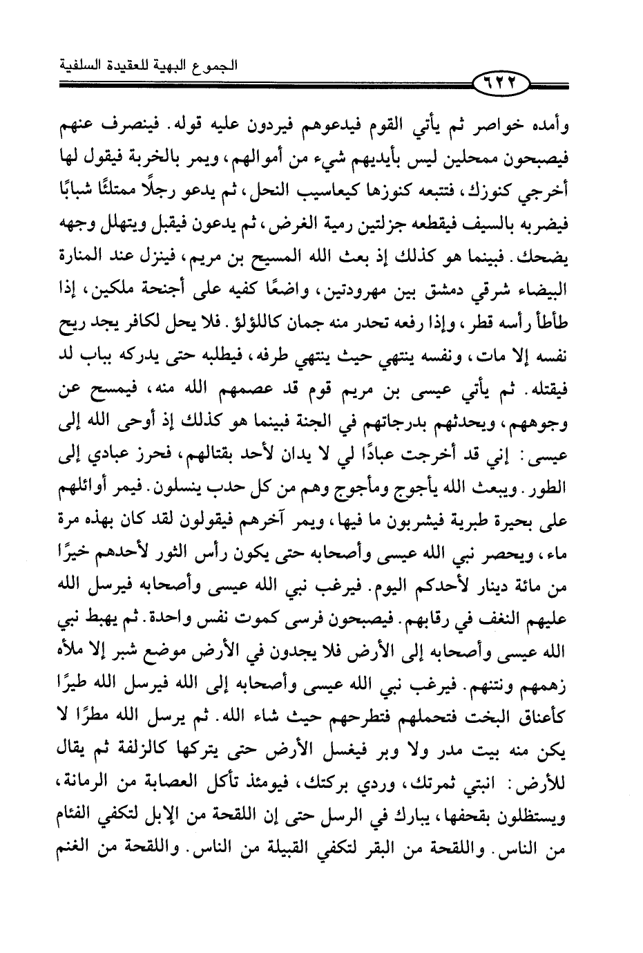 وَأَمَدَّهُ خَوَاصِرَ ثُمَّ يَأْتِي الْقَوْمَ فَيَدْعُوهُمْ فَيَرُدُّونَ عَلَيْهِ قَوْلَهُ. فَيَنْصَرِفُ عَنْهُمْ فَيُصْبِحُونَ مُمْحِلِينَ لَيْسَ بِأَيْدِيهِمْ شَيْءٌ مِنْ أَمْوَالِهِمْ، وَيَمُرُّ بِالْخَرِبَةِ فَيَقُولُ لَهَا أَخْرِجِي كُنُوزَكِ، فَتُتْبِعُهُ كُنُوزَهَا كَيَعَاسِيبِ النَّحْلِ، ثُمَّ يَدْعُو رَجُلًا مُمْتَلِئًا شَبَابًا فَيَضْرِبُهُ بِالسَّيْفِ فَيَقْطَعُهُ جَزْلَتَيْنِ رَمْيَةَ الْغَرَضِ، ثُمَّ يَدْعُونَ فَيُقْبِلُ وَيَتَهَلَّلُ وَجْهُهُ يَضْحَكُ. فَبَيْنَمَا هُوَ كَذَلِكَ إِذْ بَعَثَ اللَّهُ الْمَسِيحَ بْنَ مَرْيَمَ، فَيَنْزِلُ عِنْدَ الْمَنَارَةِ الْبَيْضَاءِ شَرْقِيَّ دِمَشْقَ بَيْنَ مَهْرُودَتَيْنِ، وَاضِعًا كَفَّيْهِ عَلَى أَجْنِحَةِ مَلَكَيْنِ، إِذَا طَأْطَأَ رَأْسَهُ قَطَرَ، وَإِذَا رَفَعَهُ تَحَدَّرَ مِنْهُ جُمَانٌ كَاللُّؤْلُؤِ. فَلَا يَحِلُّ لِكَافِرٍ يَجِدُ رِيحَ نَفَسِهِ إِلَّا مَاتَ، وَنَفَسُهُ يَنْتَهِي حَيْثُ يَنْتَهِي طَرْفُهُ، فَيَطْلُبُهُ حَتَّى يُدْرِكهُ بِبَاب لد فيقتله. ثمَّ يَأْتِي عِيسَى بن مَرْيَمَ قَوْمٌ قَدْ عَصَمَهُمُ اللَّهُ مِنْهُ، فَيَمْسَحُ عَنْ وُجُوهِهِمْ، وَيُحَدِّثُهُمْ بِدَرَجَاتِهِمْ فِي الْجَنَّةِ فَبَيْنَمَا هُوَ كَذَلِكَ إِذْ أَوْحَى اللَّهُ إِلَى عِيسَى: إِنِّي قَدْ أَخْرَجْتُ عِبَادًا لِي لَا يَدَانِ لِأَحَدٍ بِقِتَالِهِمْ، فَحَرِّزْ عِبَادِي إِلَى الطُّورِ. وَيَبْعَثُ اللَّهُ يَأْجُوجَ وَمَأْجُوجَ وَهُمْ مِنْ كُلِّ حَدَبٍ يَنْسِلُونَ. فَيَمُرُّ أَوَائِلُهُمْ عَلَى بُحَيْرَةِ طَبَرِيَّةَ فَيَشْرَبُونَ مَا فِيهَا، وَيَمُرُّ آخِرُهُمْ فَيَقُولُونَ لَقَدْ كَانَ بِهَذِهِ مَرَّةً مَاءٌ، وَيَحْصُرُ نَبِيُّ اللَّهِ عِيسَى وَأَصْحَابُهُ حَتَّى يَكُونَ رَأْسُ الثَّوْرِ لِأَحَدِهِمْ خَيْرًا مِنْ مِائَةِ دِينَارٍ لِأَحَدِكُمُ الْيَوْمَ. فَيَرْغَبُ نَبِيُّ اللَّهِ عِيسَى وَأَصْحَابُهُ فَيُرْسِلُ اللَّهُ عَلَيْهِمُ النَّغَفَ فِي رِقَابِهِمْ. فَيُصْبِحُونَ فَرْسَى كَمَوْتِ نَفْسٍ وَاحِدَةٍ. ثُمَّ يَهْبِطُ نَبِيُّ اللَّهِ عِيسَى وَأَصْحَابُهُ إِلَى الْأَرْضِ فَلَا يَجِدُونَ فِي الْأَرْضِ مَوْضِعَ شِبْرٍ إِلَّا مَلَأَهُ زَهَمُهُمْ وَنَتَنُهُمْ. فَيَرْغَبُ نَبِيُّ اللَّهِ عِيسَى وَأَصْحَابُهُ إِلَى اللَّهِ فَيُرْسِلُ اللَّهُ طَيْرًا كَأَعْنَاقِ الْبُخْتِ فَتَحْمِلُهُمْ فَتَطْرَحُهُمْ حَيْثُ شَاءَ اللَّهُ. ثُمَّ يُرْسِلُ اللَّهُ مَطَرًا لَا يُكَنُّ مِنْهُ بَيْتُ مَدَرٍ وَلَا وَبَرٍ فَيَغْسِلُ الْأَرْضَ حَتَّى يَتْرُكَهَا كَالزُّلْفَةِ ثُمَّ يُقَالُ لِلْأَرْضِ: أَنْبِتِي ثَمَرَتَكِ، وَرُدِّي بَرَكَتَكِ، فَيَوْمَئِذٍ تَأْكُلُ الْعِصَابَةُ مِنَ الرُّمَّانَةِ، وَيَسْتَظِلُّونَ بِقِحْفِهَا، يُبَارَكُ فِي الرُّسُلِ حَتَّى إِنَّ اللِّقْحَةَ مِنَ الْإِبِلِ لَتَكْفِي الْفِئَامَ مِنَ النَّاسِ.
