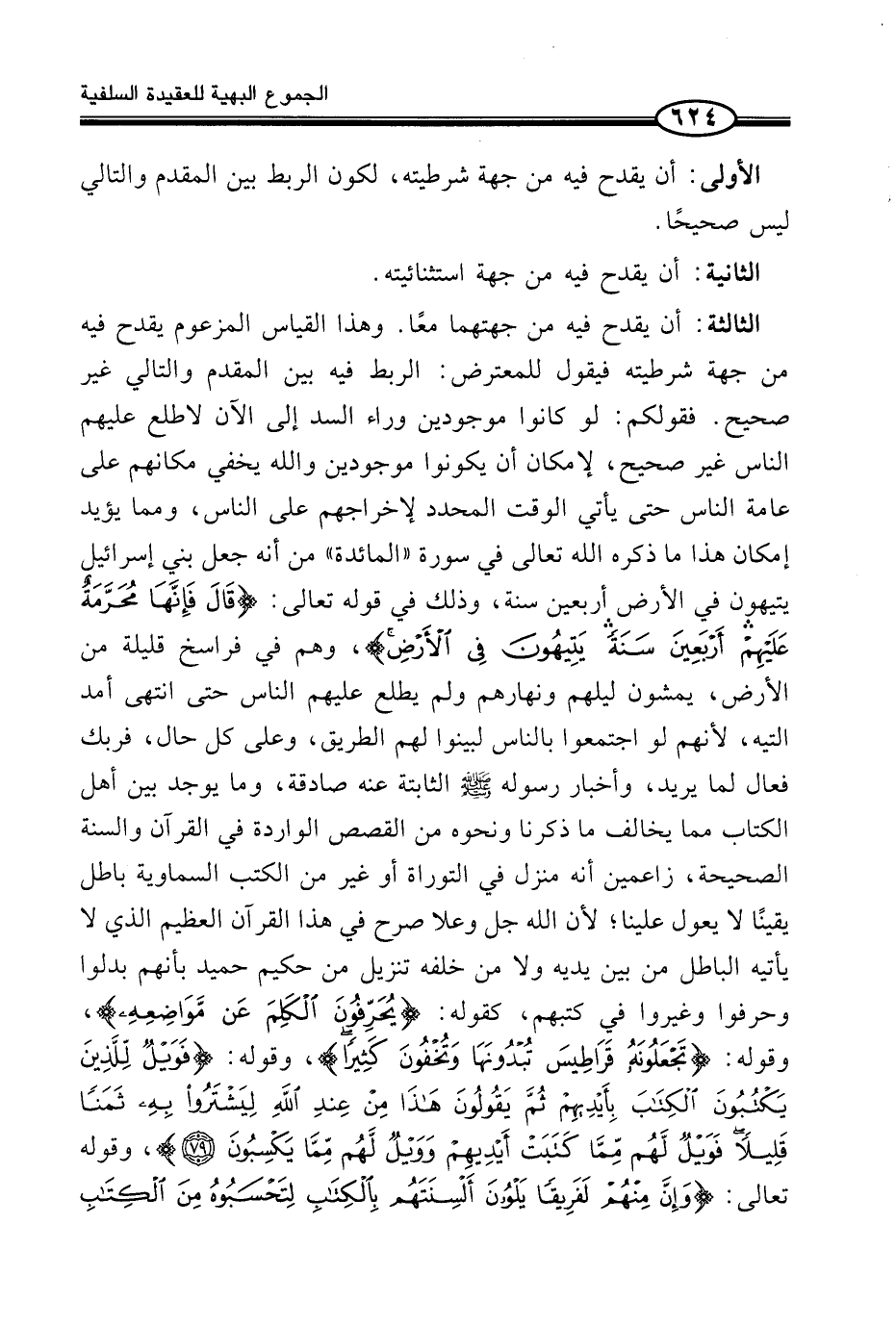 الثَّالِثَةُ: أَنْ يَقْدَحَ فِيهِ مِنْ جِهَتِهِمَا مَعًا. وَهَذَا الْقِيَاسُ الْمَزْعُومُ يَقْدَحُ فِيهِ مِنْ جِهَةِ شَرْطِيَّتِهِ فَيَقُولُ لِلْمُعْتَرِضِ: الرَّبْطُ فِيهِ بَيْنَ الْمُقَدَّمِ وَالتَّالِي غَيْرُ صَحِيحٍ. فَقَوْلُكُمْ: لَوْ كَانُوا مَوْجُودِينَ وَرَاءَ السَّدِّ إِلَى الْآنِ لَاطَّلَعَ عَلَيْهِمُ النَّاسُ غَيْرُ صَحِيحٍ، لِإِمْكَانِ أَنْ يَكُونُوا مَوْجُودِينَ وَاللَّهُ يُخْفِي مَكَانَهُمْ عَلَى عَامَّةِ النَّاسِ حَتَّى يَأْتِيَ الْوَقْتُ الْمُحَدَّدُ لِإِخْرَاجِهِمْ عَلَى النَّاسِ، وَمِمَّا يُؤَيِّدُ إِمْكَانَ هَذَا مَا ذَكَرَهُ اللَّهُ تَعَالَى فِي سُورَةِ «الْمَائِدَةِ» مِنْ أَنَّهُ جَعَلَ بَنِي إِسْرَائِيلَ يَتِيهُونَ فِي الْأَرْضِ أَرْبَعِينَ سَنَةً، وَذَلِكَ فِي قَوْلِهِ تَعَالَى: {قَالَ فَإِنَّهَا مُحَرَّمَةٌ عَلَيْهِمْ أَرْبَعِينَ سَنَةً يَتِيهُونَ فِى الأَرْضِ} ، وَهُمْ فِي فَرَاسِخَ قَلِيلَةٍ مِنَ الْأَرْضِ، يَمْشُونَ لَيْلَهُمْ وَنَهَارَهُمْ وَلَمْ يَطَّلِعْ عَلَيْهِمُ النَّاسُ حَتَّى انْتَهَى أَمَدُ التِّيهِ، لِأَنَّهُمْ لَوِ اجْتَمَعُوا بِالنَّاسِ لَبَيَّنُوا لَهُمُ الطَّرِيقَ، وَعَلَى كُلِّ حَالٍ، فَرَبُّكَ فَعَّالٌ لِمَا يُرِيدُ، وَأَخْبَارُ رَسُولِهِ صَلَّى اللَّهُ عَلَيْهِ وَسَلَّمَ الثَّابِتَةُ عَنْهُ صَادِقَةٌ، وَمَا يُوجَدُ بَيْنَ أَهْلِ الْكِتَابِ مِمَّا يُخَالِفُ مَا ذَكَرْنَا وَنَحْوَهُ مِنَ الْقِصَصِ الْوَارِدَةِ فِي الْقُرْآنِ وَالسَّنَةِ الصَّحِيحَةِ، زَاعِمِينَ أَنَّهُ مُنَزَّلٌ فِي التَّوْرَاةِ أَوْ غير مِنَ الْكُتُبِ السَّمَاوِيَّةِ بَاطِلٌ يَقِينًا لَا يُعَوَّلُ عَلَيْنَا؛ لِأَنَّ اللَّهَ جَلَّ وَعَلَا صَرَّحَ فِي هَذَا الْقُرْآنِ الْعَظِيمِ الَّذِي لَا يَأْتِيهِ الْبَاطِلُ مِنْ بَيْنِ يَدَيْهِ وَلَا مِنْ خَلْفِهِ تَنْزِيلٌ مِنْ حَكِيمٍ حَمِيدٍ بِأَنَّهُمْ بَدَّلُوا وَحَرَّفُوا وَغَيَّرُوا فِي كُتُبِهِمْ، كَقَوْلِهِ: {يُحَرِّفُونَ الْكَلِمَ عَن مَّوَاضِعِهِ} ، وَقَوْلِهِ: {تَجْعَلُونَهُ قَرَاطِيسَ تُبْدُونَهَا وَتُخْفُونَ كَثِيراً} ، وَقَوْلِهِ: {فَوَيْلٌ لِّلَّذِينَ يَكْتُبُونَ الْكِتَابَ بِأَيْدِيهِمْ ثُمَّ يَقُولُونَ هَذَا مِنْ عِندِ اللَّهِ لِيَشْتَرُواْ بِهِ ثَمَنًا قَلِيلاً فَوَيْلٌ لَّهُمْ مِّمَّا كَتَبَتْ أَيْدِيهِمْ وَوَيْلٌ لَّهُمْ مِّمَّا يَكْسِبُونَ} ، وَقَوْلِهِ تَعَالَى: {وَإِنَّ مِنْهُمْ لَفَرِيقًا يَلْوُونَ أَلْسِنَتَهُم بِالْكِتَابِ لِتَحْسَبُوهُ مِنَ الْكِتَابِ