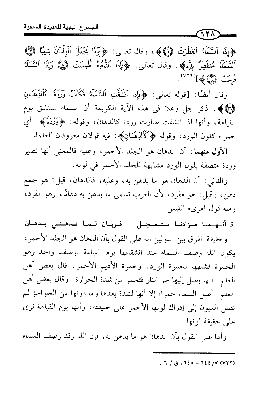 وَقَالَ أَيْضا: [قَوْله تَعَالَى: {فَإِذَا انشَقَّتِ السَّمَآءُ فَكَانَتْ وَرْدَةً كَالدِّهَانِ} . ذَكَرَ جَلَّ وَعَلَا فِي هَذِهِ الْآيَةِ الْكَرِيمَةِ أَنَّ السَّمَاءَ سَتَنْشَقُّ يَوْمَ الْقِيَامَةِ، وَأَنَّهَا إِذَا انْشَقَّتْ صَارَتْ وَرْدَةً كَالدِّهَانِ، وَقَوْلُهُ: {وَرْدَةً} : أَيْ حَمْرَاءَ كَلَوْنِ الْوَرْدِ، وَقَوْلُهُ {كَالدِّهَانِ} : فِيهِ قَوْلَانِ مَعْرُوفَانِ لِلْعُلَمَاءِ.