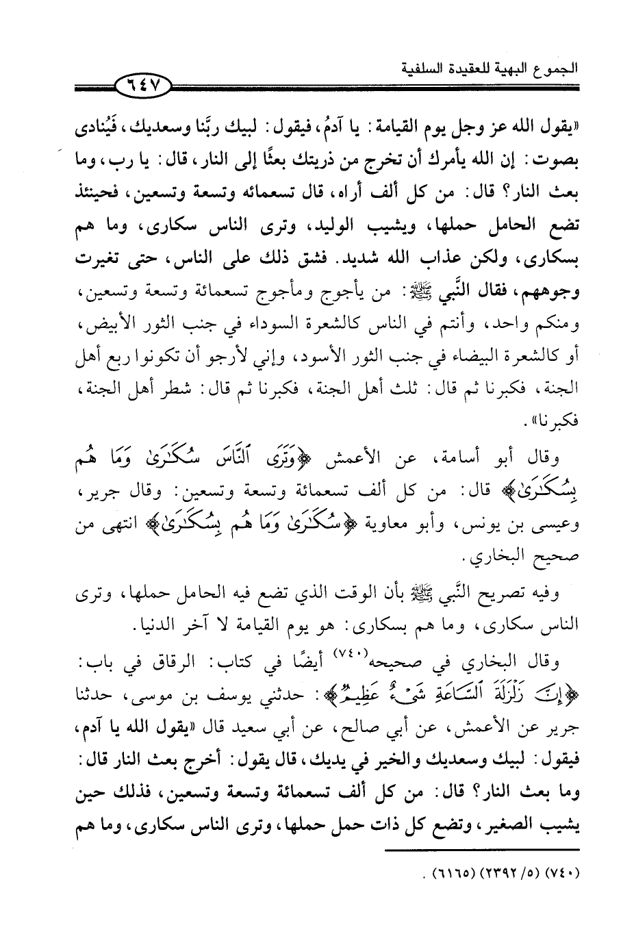 وَقَالَ أَبُو أُسَامَةَ، عَنِ الْأَعْمَشِ {وَتَرَى النَّاسَ سُكَارَى وَمَا هُم بِسُكَارَى} قَالَ: من كل ألف تِسْعمائَة وَتِسْعَة وَتِسْعين: وَقَالَ جرير، وَعِيسَى بن يُونُس، وَأَبُو مُعَاوِيَة {سُكَارَى وَمَا هُم بِسُكَارَى} انْتَهَى مِنْ صَحِيحِ الْبُخَارِيِّ.
