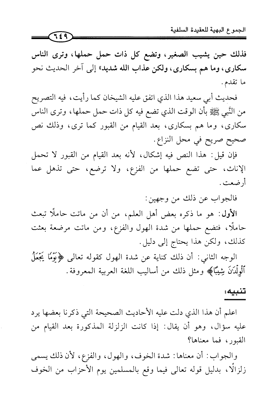 فَحَدِيثُ أَبِي سَعِيدٍ هَذَا الَّذِي اتَّفَقَ عَلَيْهِ الشَّيْخَانِ كَمَا رَأَيْتَ، فِيهِ التَّصْرِيحُ مِنَ النَّبي صَلَّى اللَّهُ عَلَيْهِ وَسَلَّمَ بِأَنَّ الْوَقْتَ الَّذِي تَضَعُ فِيهِ كُلُّ ذَاتِ حَمْلٍ حَمْلَهَا، وَتَرَى النَّاسَ سُكَارَى، وَمَا هُمْ بِسُكَارَى، بَعْدَ الْقِيَامِ مِنَ الْقُبُورِ كَمَا تَرَى، وَذَلِكَ نَصٌّ صَحِيحٌ صَرِيحٌ فِي مَحَلِّ النِّزَاعِ.
