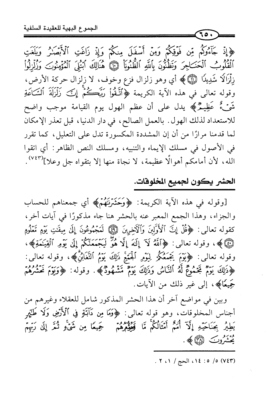 وَبَيَّنَ فِي مَوَاضِع آخَرَ أَنَّ هَذَا الْحَشْرَ الْمَذْكُورَ شَامِلٌ لِلْعُقَلَاءِ وَغَيْرِهِمْ مِنْ أَجْنَاسِ الْمَخْلُوقَاتِ، وَهُوَ قَوْلُهُ تَعَالَى: {وَمَا مِن دَآبَّةٍ فِى الأَرْضِ وَلاَ طَائِرٍ يَطِيرُ بِجَنَاحَيْهِ إِلاَّ أُمَمٌ أَمْثَالُكُمْ مَّا فَرَّطْنَا فِى الكِتَابِ مِن شَىْءٍ ثُمَّ إِلَى رَبِّهِمْ يُحْشَرُونَ} .