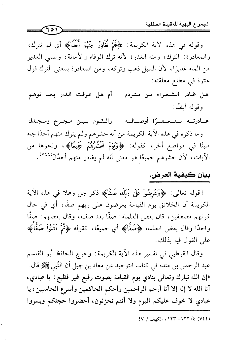 وَمَا ذَكَرَهُ فِي هَذِهِ الْآيَةِ الْكَرِيمَةِ مِنْ أَنَّهُ حَشَرَهُمْ وَلَمْ يَتْرُكْ مِنْهُمْ أَحَدًا جَاءَ مُبَيَّنًا فِي مَوَاضِعَ أُخَرَ، كَقَوْلِهِ: {وَيَوْمَ نَحْشُرُهُمْ جَمِيعاً} ، وَنَحْوِهَا مِنَ الْآيَاتِ، لِأَنَّ حَشْرَهُمْ جَمِيعًا هُوَ معنى أَنه لم يُغَادر مِنْهُم أحدا.] (¬1) .