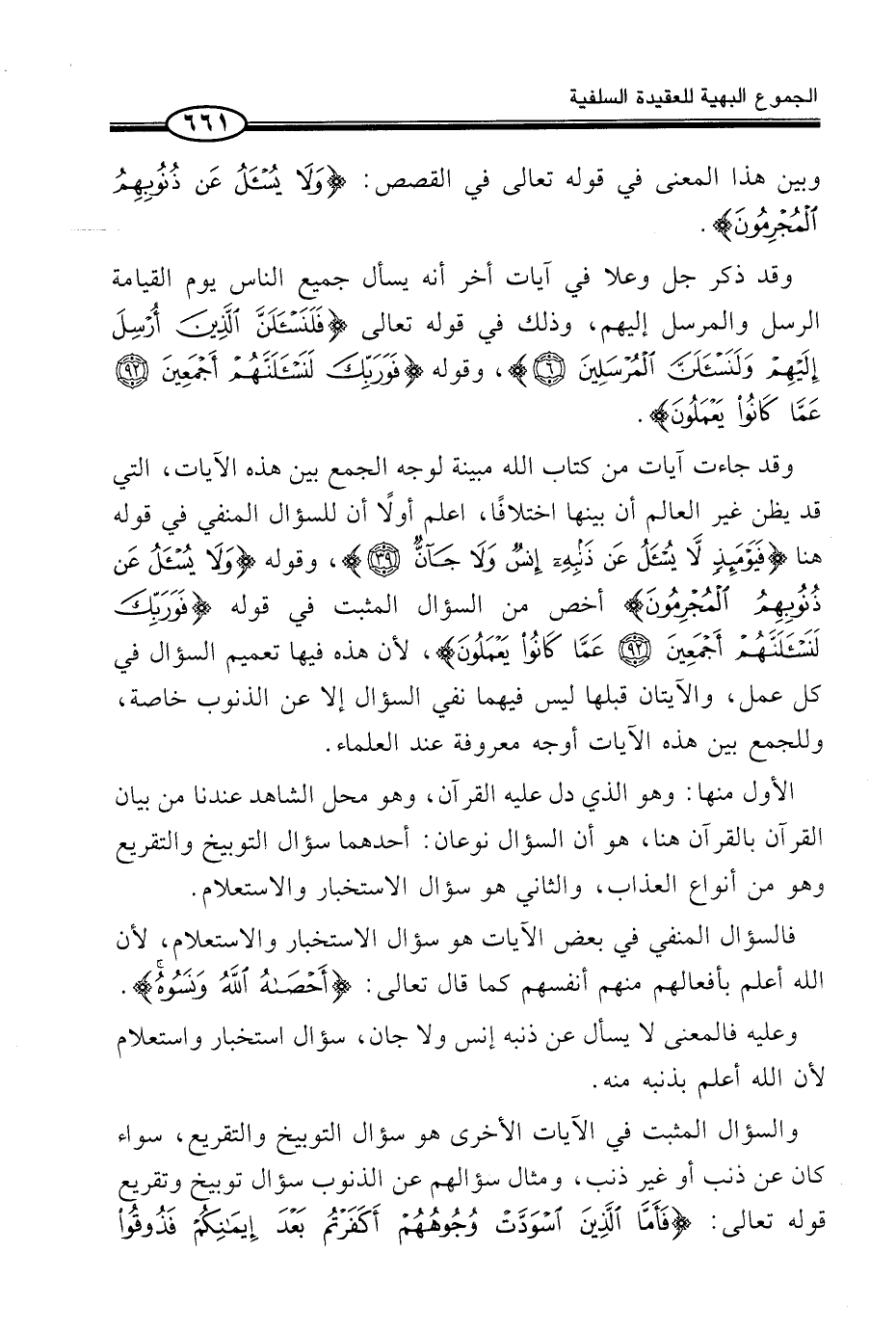 وَقَدْ جَاءَتْ آيَاتٌ مِنْ كِتَابِ اللَّهِ مُبَيِّنَةً لِوَجْهِ الْجَمْعِ بَيْنَ هَذِهِ الْآيَاتِ، الَّتِي قَدْ يَظُنُّ غَيْرُ الْعَالِمِ أَن بَينهَا اخْتِلَافا، اعْلَم أَولا أَن للسؤال الْمَنْفِيَّ فِي قَوْلِهِ هُنَا {فَيَوْمَئِذٍ لاَّ يُسْألُ عَن ذَنبِهِ إِنسٌ وَلاَ جَآنٌّ} ، وَقَوْلِهِ {وَلاَ يُسْأَلُ عَن ذُنُوبِهِمُ الْمُجْرِمُونَ} أَخَصُّ مِنَ السُّؤَالِ الْمُثْبَتِ فِي قَوْلِهِ {فَوَرَبِّكَ لَنَسْألَنَّهُمْ أَجْمَعِينَ عَمَّا كَانُواْ يَعْمَلُونَ} ، لِأَنَّ هَذِهِ فِيهَا تَعْمِيمُ السُّؤَالِ فِي كُلِّ عَمَلٍ، وَالْآيَتَانِ قَبْلَهَا لَيْسَ فِيهِمَا نَفْيُ السُّؤَالِ إِلَّا عَنِ الذُّنُوبِ خَاصَّةً، وَلِلْجَمْعِ بَيْنَ هَذِهِ الْآيَاتِ أَوْجُهٌ مَعْرُوفَةٌ عِنْدَ الْعُلَمَاءِ.