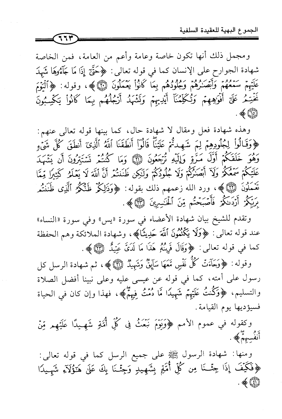 وَمُجْمَلُ ذَلِكَ أَنَّهَا تَكُونُ خَاصَّةً وَعَامَّةً وَأَعَمَّ مِنَ الْعَامَّةِ، فَمِنَ الْخَاصَّةِ شَهَادَةُ الْجَوَارِحِ عَلَى الْإِنْسَانِ كَمَا فِي قَوْلُهُ تَعَالَى: {حَتَّى إِذَا مَا جَآءُوهَا شَهِدَ عَلَيْهِمْ سَمْعُهُمْ وَأَبْصَارُهُمْ وَجُلُودُهُم بِمَا كَانُواْ يَعْمَلُونَ} ، وَقَوْلِهِ: {الْيَوْمَ نَخْتِمُ عَلَى أَفْوَاهِهِمْ وَتُكَلِّمُنَآ أَيْدِيهِمْ وَتَشْهَدُ أَرْجُلُهُمْ بِمَا كَانُواْ يَكْسِبُونَ} ، وَهَذِهِ شَهَادَةُ فِعْلٍ وَمَقَالٍ لَا شَهَادَةُ حَالٍ، كَمَا بَيَّنَهَا قَوْلُهُ تَعَالَى عَنْهُمْ: {وَقَالُواْ لِجُلُودِهِمْ لِمَ شَهِدتُّمْ عَلَيْنَا قَالُواْ أَنطَقَنَا اللَّهُ الَّذِى أَنطَقَ كُلَّ شَىْءٍ وَهُوَ خَلَقَكُمْ أَوَّلَ مَرَّةٍ وَإِلَيْهِ تُرْجَعُونَ وَمَا كُنتُمْ تَسْتَتِرُونَ أَن يَشْهَدَ عَلَيْكُمْ سَمْعُكُمْ وَلاَ أَبْصَارُكُمْ وَلاَ جُلُودُكُمْ وَلكن ظَنَنتُمْ أَنَّ اللَّهَ لاَ يَعْلَمُ كَثِيراً مِّمَّا تَعْمَلُونَ} ، وَرَدَّ اللَّهُ زَعْمَهُمْ ذَلِكَ بِقَوْلِهِ: {وَذَلِكُمْ ظَنُّكُمُ الَّذِى ظَنَنتُم بِرَبِّكُمْ أَرْدَاكُمْ فَأَصْبَحْتُمْ مِّنَ الُخَاسِرِينَ} .