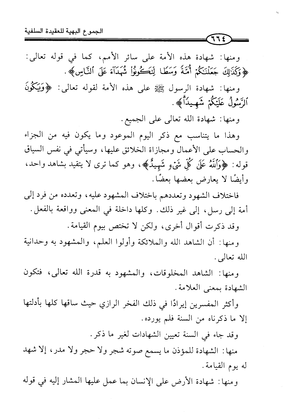 وَمِنْهَا: شَهَادَةُ الرَّسُولِ صَلَّى اللَّهُ عَلَيْهِ وَسَلَّمَ عَلَى هَذِهِ الْأُمَّةِ لِقَوْلِهِ تَعَالَى: {وَيَكُونَ الرَّسُولُ عَلَيْكُمْ شَهِيدًا} .