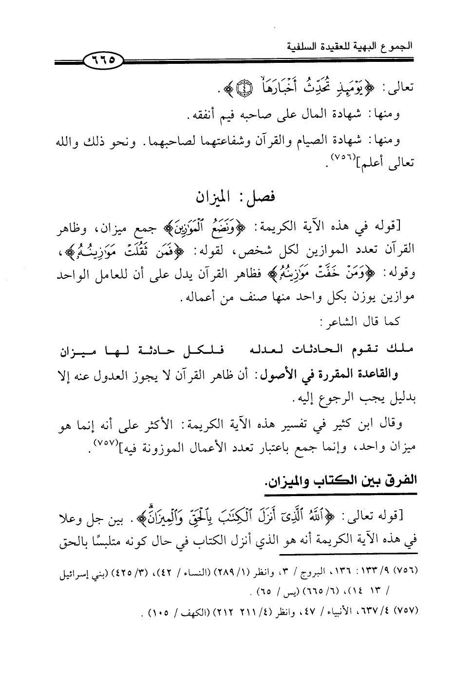 وَالْقَاعِدَةُ الْمُقَرَّرَةُ فِي الْأُصُولِ: أَنَّ ظَاهِرَ الْقُرْآنِ لَا يَجُوزُ الْعُدُولُ عَنْهُ إِلَّا بِدَلِيلٍ يَجِبُ الرُّجُوعُ إِلَيْهِ. وَقَالَ ابْنُ كَثِيرٍ فِي تَفْسِيرِ هَذِهِ الْآيَةِ الْكَرِيمَةِ: الْأَكْثَرُ عَلَى أَنَّهُ إِنَّمَا هُوَ مِيزَانٌ وَاحِدٌ، وَإِنَّمَا جُمِعَ بِاعْتِبَارِ تَعَدُّدِ الْأَعْمَالِ الموزونة فِيهِ.] (¬2) .