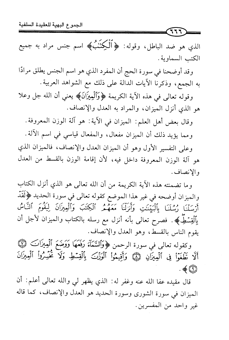 قَالَ مُقَيِّدُهُ عَفَا اللَّهُ عَنْهُ وَغَفَرَ لَهُ: الَّذِي يَظْهَرُ لِي وَاللَّهُ تَعَالَى أَعْلَمُ: أَنَّ الْمِيزَانَ فِي سُورَةِ الشُّورَى وَسُورَةِ الْحَدِيدِ هُوَ الْعَدْلُ وَالْإِنْصَافُ، كَمَا قَالَهُ غَيْرُ وَاحِدٍ مِنَ الْمُفَسّرين.