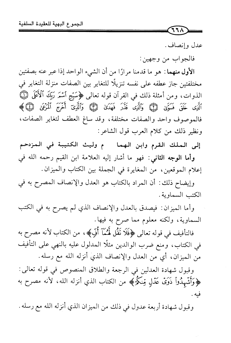 الْأَوَّلُ مِنْهُمَا هُوَ مَا قَدَّمْنَا مِرَارًا مِنْ أَنَّ الشَّيْءَ الْوَاحِدَ إِذَا عُبِّرَ عَنْهُ بِصِفَتَيْنِ مُخْتَلِفَتَيْنِ جَازَ عَطْفُهُ عَلَى نَفْسِهِ تَنْزِيلًا لِلتَّغَايُرِ بَيْنَ الصِّفَاتِ مَنْزِلَةَ التَّغَايُرِ فِي الذَّوَاتِ، وَمِنْ أَمْثِلَةِ ذَلِكَ فِي الْقُرْآنِ قَوْلُهُ تَعَالَى {سَبِّحِ اسْمَ رَبِّكَ الاّعْلَى الَّذِى خَلَقَ فَسَوَّى وَالَّذِى قَدَّرَ فَهَدَى وَالَّذِى أَخْرَجَ الْمَرْعَى} فَالْمَوْصُوفُ وَاحِدٌ وَالصِّفَاتُ مُخْتَلِفَةٌ، وَقَدْ سَاغَ الْعَطْفُ لِتَغَايُرِ الصِّفَاتِ، وَنَظِيرُ ذَلِكَ مِنْ كَلَامِ الْعَرَبِ قَوْلُ الشَّاعِرِ: