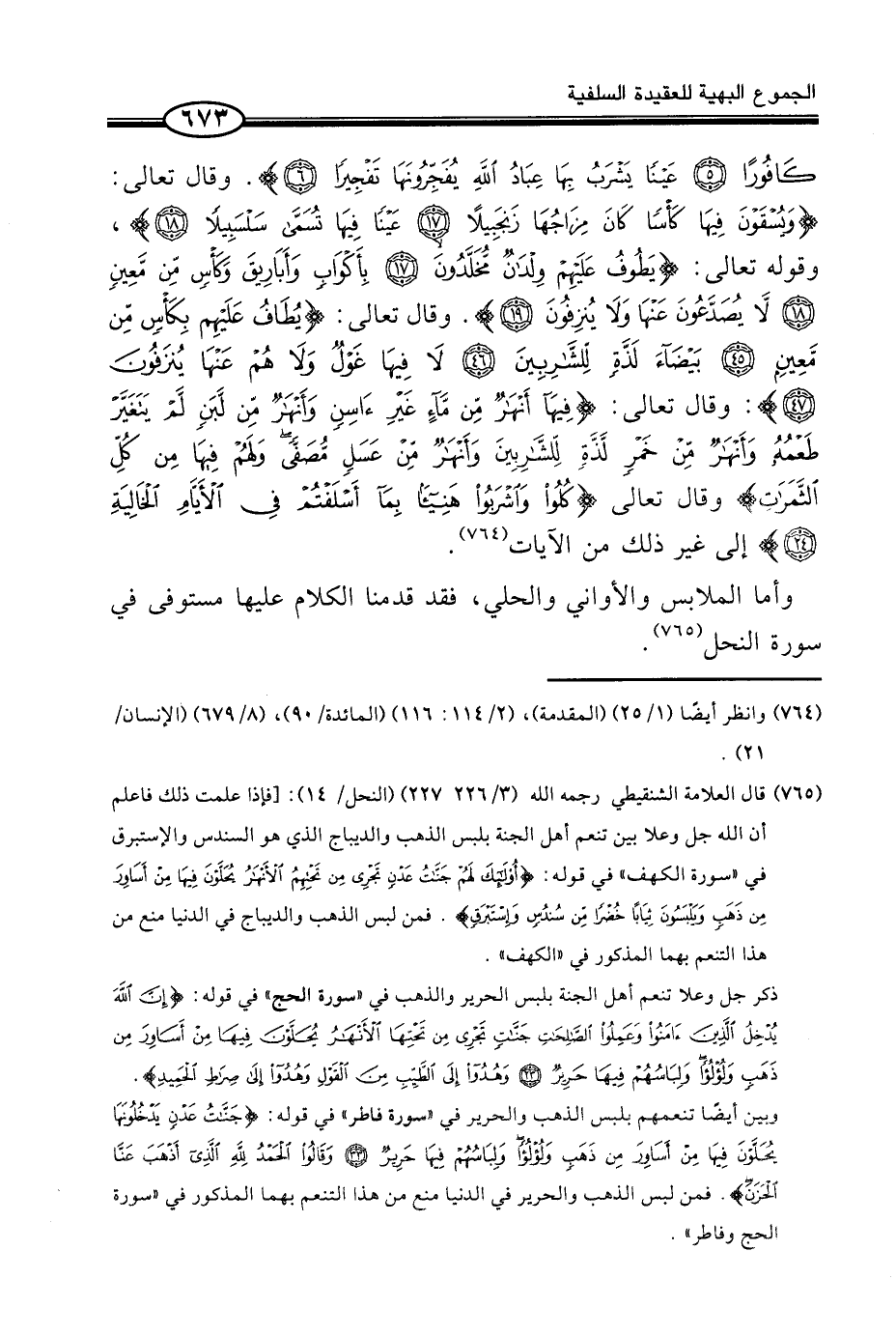 (¬2) - قَالَ الْعَلامَة الشنقيطي - رجمه الله - (3/226 - 227) (النَّحْل/ 14) : [فَإِذَا عَلِمْتَ ذَلِكَ فَاعْلَمْ أَنَّ اللَّهَ جَلَّ وَعَلَا بَيَّنَ تَنَعُّمَ أَهْلِ الْجَنَّةِ بِلُبْسِ الذَّهَبِ وَالدِّيبَاجِ الَّذِي هُوَ السُّنْدُسُ وَالْإِسْتَبْرَقُ فِي «سُورَةِ الْكَهْفِ» فِي قَوْلِهِ: {أُولَئِكَ لَهُمْ جَنَّاتُ عَدْنٍ تَجْرِى مِن تَحْتِهِمُ الأَنْهَارُ يُحَلَّوْنَ فِيهَا مِنْ أَسَاوِرَ مِن ذَهَبٍ وَيَلْبَسُونَ ثِيَابًا خُضْرًا مِّن سُنْدُسٍ وَإِسْتَبْرَقٍ} . فَمَنْ لَبِسَ الذَّهَبَ وَالدِّيبَاجَ فِي الدُّنْيَا مُنِعَ مِنْ هَذَا التَّنَعُّمِ بِهِمَا الْمَذْكُورِ فِي «الْكَهْفِ» .