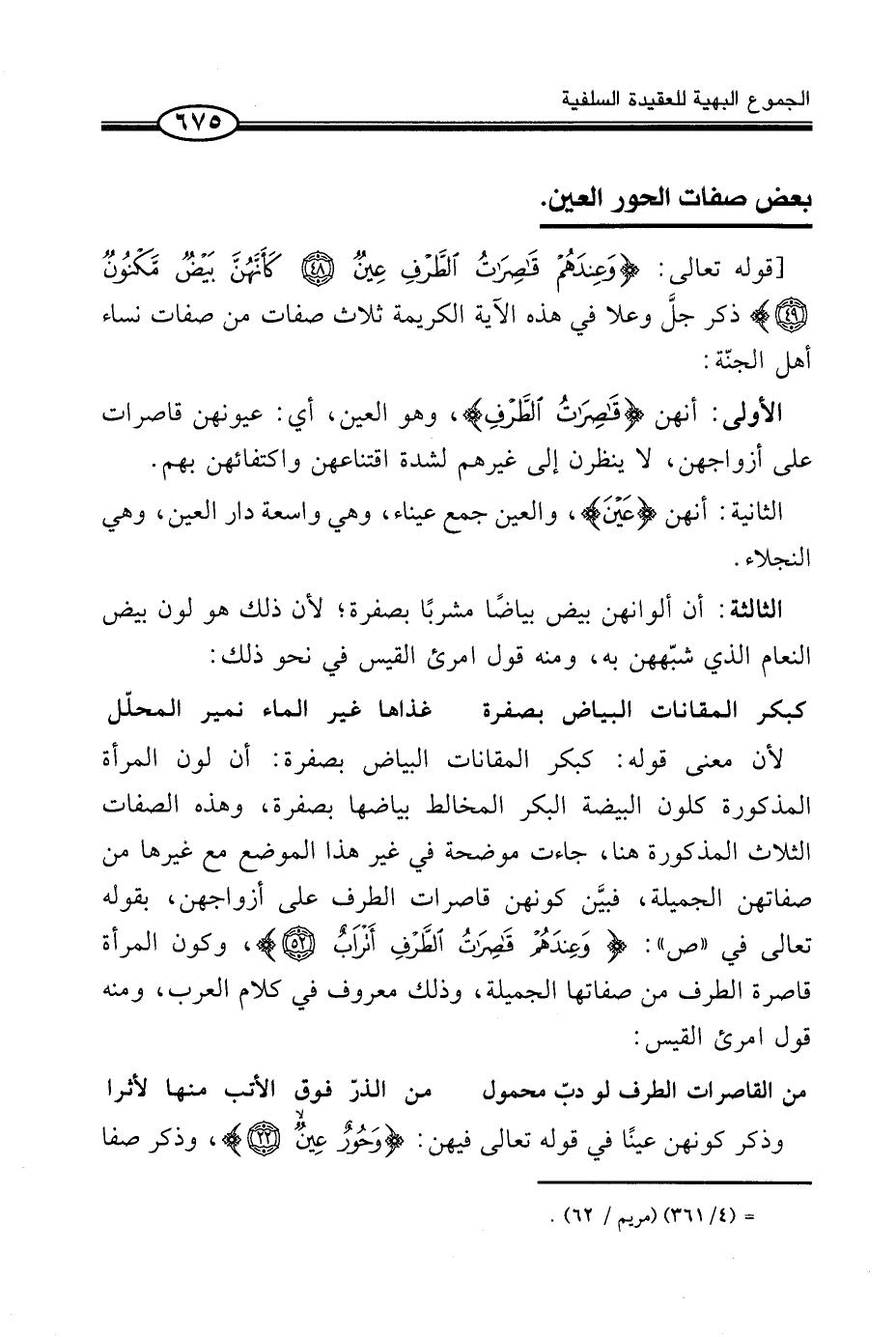لِأَنَّ مَعْنَى قَوْلِهِ: كَبِكْرِ الْمُقَانَاتِ الْبَيَاضُ بِصُفْرَةٍ: أَنَّ لَوْنَ الْمَرْأَةِ الْمَذْكُورَةِ كَلَوْنِ الْبَيْضَةِ الْبِكْرِ الْمُخَالِطِ بَيَاضُهَا بِصُفْرَةٍ، وَهَذِهِ الصِّفَاتُ الثَّلَاثُ الْمَذْكُورَةُ هُنَا، جَاءَتْ مُوَضَّحَةً فِي غَيْرِ هَذَا الْمَوْضِعِ مَعَ غَيْرِهَا مِنْ صِفَاتِهِنَّ الْجَمِيلَةِ، فبيَّن كَوْنَهُنَّ قَاصِرَاتُ الطَّرْفِ عَلَى أَزْوَاجِهِنَّ، بِقَوْلِهِ تَعَالَى فِي «ص» : {وَعِندَهُمْ قَاصِراتُ الطَّرْفِ أَتْرَابٌ} ، وَكَوْنُ الْمَرْأَةِ قَاصِرَةُ الطَّرَفِ مِنْ صِفَاتِهَا الْجَمِيلَةِ، وَذَلِكَ مَعْرُوفٌ فِي كَلَامِ الْعَرَبِ، وَمِنْهُ قَوْلُ امْرِئِ الْقَيْس: