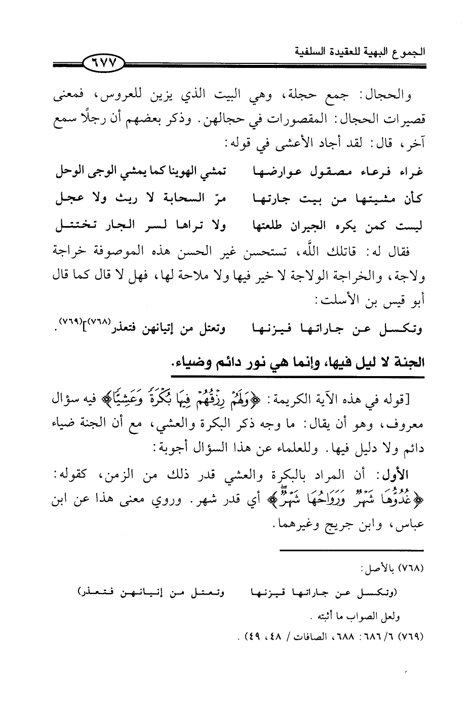 [قَوْله فِي هَذِهِ الْآيَةِ الْكَرِيمَةِ: {وَلَهُمْ رِزْقُهُمْ فِيهَا بُكْرَةً وَعَشِيّاً} فِيهِ سُؤَالٌ مَعْرُوفٌ، وَهُوَ أَنْ يُقَالَ: مَا وَجْهُ ذِكْرِ الْبُكْرَةِ وَالْعَشِيِّ، مَعَ أَن الْجنَّة ضِيَاء دَائِم وَلَا دَلِيل فِيهَا. وَلِلْعُلَمَاءِ عَنْ هَذَا السُّؤَالِ أَجْوِبَةٌ: