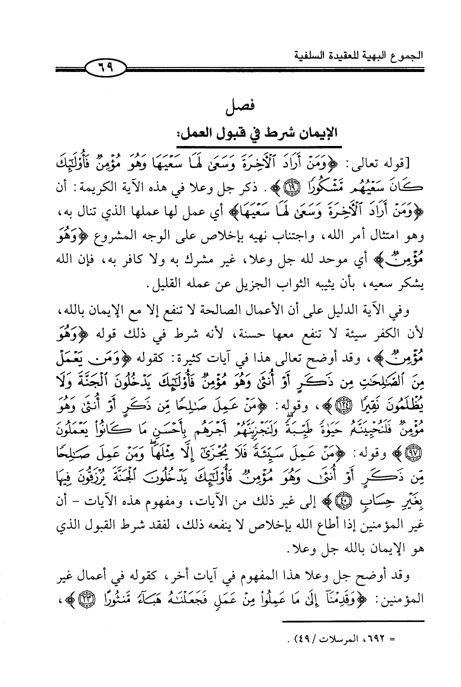 فصل: الْإِيمَان شَرط فِي قبُول الْعَمَل: