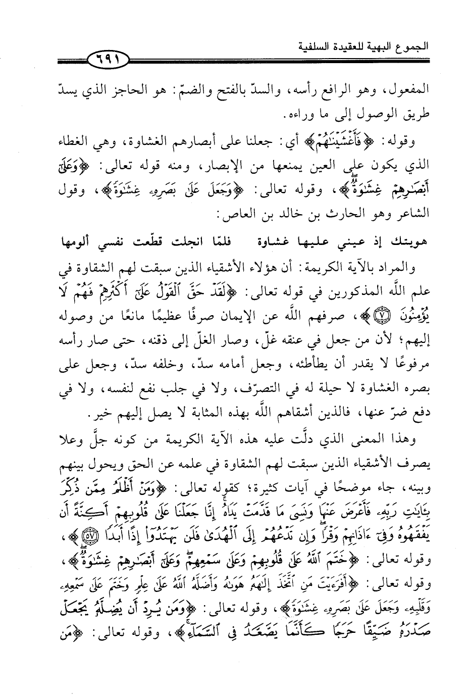 وَالْمُرَادُ بِالْآيَةِ الْكَرِيمَةِ: أَنَّ هَؤُلَاءِ الْأَشْقِيَاءَ الَّذِينَ سَبَقَتْ لَهُمُ الشَّقَاوَةُ فِي عِلْمِ اللَّه الْمَذْكُورِينَ فِي قَوْلِهِ تَعَالَى: {لَقَدْ حَقَّ الْقَوْلُ عَلَى أَكْثَرِهِمْ فَهُمْ لاَ يُؤمِنُونَ} ، صَرَفَهُمُ اللَّه عَنِ الْإِيمَانِ صَرْفًا عَظِيمًا مَانِعًا مِنْ وُصُولِهِ إِلَيْهِمْ؛ لِأَنَّ مَنْ جُعِلَ فِي عُنُقِهِ غُلٌّ، وَصَارَ الْغُلُّ إِلَى ذَقَنِهِ، حَتَّى صَارَ رَأْسُهُ مَرْفُوعًا لَا يقدر أَن يطأطئه، وَجعل أَمَامه سدّ، وَخَلفه سدّ، وَجَعَلَ عَلَى بَصَرِهِ الْغِشَاوَةَ لَا حِيلَةَ لَهُ فِي التَّصَرُّفِ، وَلَا فِي جَلْبِ نَفْعٍ لِنَفْسِهِ، وَلَا فِي دَفْعِ ضُرٍّ عَنْهَا، فَالَّذِينَ أَشْقَاهُمُ اللَّه بِهَذِهِ الْمَثَابَةِ لَا يَصِلُ إِلَيْهِمْ خَيْرٌ.