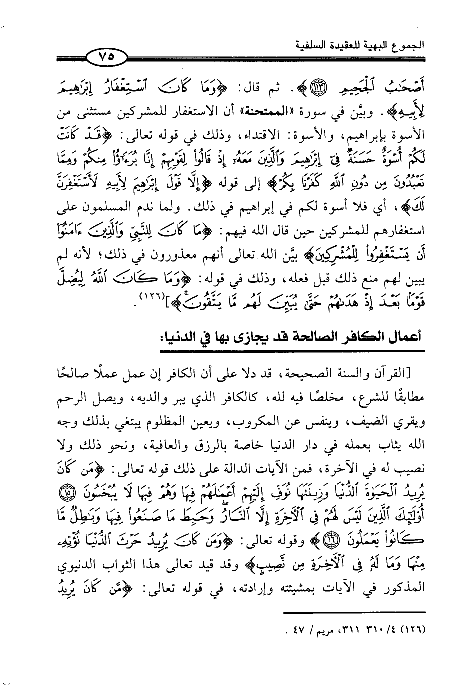 أَصْحَابُ الْجَحِيمِ) . ثُمَّ قَالَ: (وَمَا كَانَ اسْتِغْفَارُ إِبْرَاهِيمَ لأَبِيهِ) . وبيَّن فِي سُورَةِ «الْمُمْتَحِنَةِ» أَنَّ الِاسْتِغْفَارَ لِلْمُشْرِكِينَ مُسْتَثْنًى مِنَ الْأُسْوَةِ بِإِبْرَاهِيمَ، وَالْأُسْوَةُ: الِاقْتِدَاءُ، وَذَلِكَ فِي قَوْلِهِ تَعَالَى: (قَدْ كَانَتْ لَكُمْ أُسْوَةٌ حَسَنَةٌ فِي إِبْرَاهِيمَ وَالَّذِينَ مَعَهُ إِذْ قَالُوا لِقَوْمِهِمْ إِنَّا بُرَآءُ مِنكُمْ وَمِمَّا تَعْبُدُونَ مِن دُونِ اللَّهِ كَفَرْنَا) إِلَى قَوْلِهِ (إِلاَّ قَوْلَ إِبْرَاهِيمَ لأَبِيهِ لأَسْتَغْفِرَنَّ لَكَ) ، أَيْ فَلَا أُسْوَةَ لَكُمْ فِي إِبْرَاهِيمَ فِي ذَلِكَ.