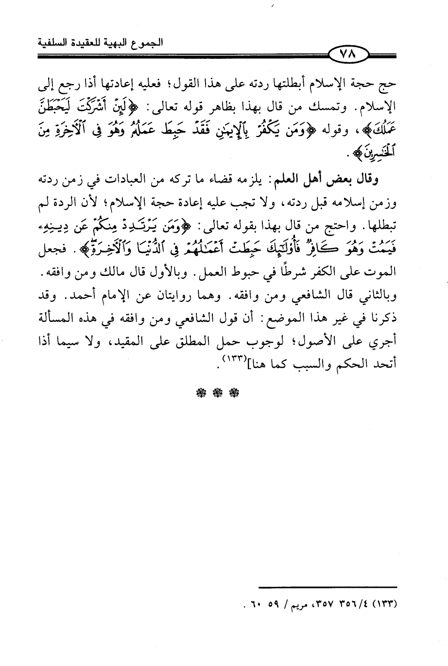 حَجَّ حَجَّةَ الْإِسْلَامِ أَبْطَلَتْهَا رِدَّتُهُ عَلَى هَذَا الْقَوْلِ؛ فَعَلَيْهِ إِعَادَتُهَا إِذَا رَجَعَ إِلَى الْإِسْلَامِ. وَتَمَسَّكَ مَنْ قَالَ بِهَذَا بِظَاهِرِ قَوْلِهِ تَعَالَى: (لَئِنْ أَشْرَكْتَ لَيَحْبَطَنَّ عَمَلُكَ) ، وَقَوْلِهِ (وَمَن يَكْفُرْ بِالإِيمَانِ فَقَدْ حَبِطَ عَمَلُهُ وَهُوَ فِى الآخِرَةِ مِنَ الْخَاسِرِينَ) . وَقَالَ بَعْضُ أَهْلِ الْعِلْمِ: يَلْزَمُهُ قَضَاءُ مَا تَرَكَهُ مِنَ الْعِبَادَاتِ فِي زَمَنِ رِدَّتِهِ وَزَمَنِ إِسْلَامِهِ قَبْلَ رِدَّتِهِ، وَلَا تَجِبُ عَلَيْهِ إِعَادَةُ حَجَّةِ الْإِسْلَامِ؛ لِأَنَّ الرِّدَّةَ لَمْ تُبْطِلْهَا. وَاحْتَجَّ مَنْ قَالَ بِهَذَا بِقَوْلِهِ تَعَالَى: (وَمَن يَرْتَدِدْ مِنكُمْ عَن دِينِهِ فَيَمُتْ وَهُوَ كَافِرٌ فَأولئك حَبِطَتْ أَعْمَالُهُمْ فِي الدُّنْيَا وَالآخِرَةِ) . فَجَعَلَ الْمَوْتَ عَلَى الْكُفْرِ شَرْطًا فِي حُبُوطِ الْعَمَلِ. وَبِالْأَوَّلِ قَالَ مَالِكٌ وَمَنْ وَافَقَهُ. وَبِالثَّانِي قَالَ الشَّافِعِيُّ وَمَنْ وَافَقَهُ. وَهُمَا رِوَايَتَانِ عَنِ الْإِمَامِ أَحْمَدَ. وَقَدْ ذَكَرْنَا فِي غَيْرِ هَذَا الْمَوْضِعِ: أَنَّ قَوْلَ الشَّافِعِيِّ وَمَنْ وَافَقَهُ فِي هَذِهِ الْمَسْأَلَةِ أَجْرَى عَلَى الْأُصُولِ؛ لِوُجُوبِ حَمْلُ الْمُطْلَقِ عَلَى الْمُقَيَّدِ، وَلَا سِيَّمَا إِذَا اتَّحَدَ الحكم وَالسَّبَب كَمَا هُنَا] (¬1) .