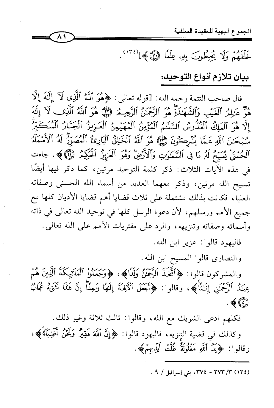 قَالَ صَاحب التَّتِمَّة - رَحمَه الله -[قَوْلُهُ تَعَالَى: {هُوَ اللَّهُ الَّذِي لاَ إِلَهَ إِلاَّ هُوَ عَالِمُ الغَيْبِ وَالشَّهَادَةِ هُوَ الرَّحْمَنُ الرَّحِيمُ. هُوَ اللَّهُ الَّذِي لاَ إِلَهَ إِلاَّ هُوَ المَلِكُ القُدُّوسُ السَّلامُ المُؤْمِنُ المُهَيْمِنُ العَزِيزُ الجَبَّارُ المُتَكَبِّرُ سُبْحَانَ اللَّهِ عَمَّا يُشْرِكُونَ. هُوَ اللَّهُ الخَالِقُ البَارِئُ المُصَوِّرُ لَهُ الأَسْمَاءُ الحُسْنَى يُسَبِّحُ لَهُ مَا فِي السَّمَوَاتِ وَالأَرْضِ وَهُوَ العَزِيزُ الحَكِيمُ} } . جَاءَتْ فِي هَذِهِ الْآيَاتِ الثَّلَاثِ: ذِكْرُ كَلِمَةِ التَّوْحِيدِ مَرَّتَيْنِ، كَمَا ذُكِرَ فِيهَا أَيْضًا تَسْبِيحُ اللَّهِ مَرَّتَيْنِ، وَذُكِرَ مَعَهُمَا الْعَدِيدُ مِنْ أَسْمَاءِ اللَّهِ الْحُسْنَى وَصِفَاتِهِ الْعُلْيَا، فَكَانَتْ بِذَلِكَ مُشْتَمِلَةً عَلَى ثَلَاثِ قَضَايَا أَهَمِّ قَضَايَا الْأَدْيَانِ كُلِّهَا مَعَ جَمِيعِ الْأُمَمِ وَرُسُلِهِمْ، لِأَنَّ دَعْوَةَ الرُّسُلِ كُلَّهَا فِي تَوْحِيدِ اللَّهِ تَعَالَى فِي ذَاتِهِ وَأَسْمَائِهِ وَصِفَاتِهِ وَتَنْزِيهِهِ، وَالرَّدِّ عَلَى مُفْتَرَيَاتِ الْأُمَمِ عَلَى اللَّهِ تَعَالَى.