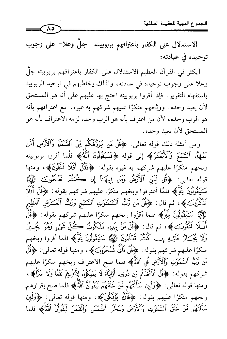 [يكثر فِي الْقُرْآنِ الْعَظِيمِ الِاسْتِدْلَالُ عَلَى الْكُفَّارِ بِاعْتِرَافِهِمْ بربوبيته جلَّ وَعلا ـ على وجوب توحيده فِي عِبَادَتِهِ، وَلِذَلِكَ يُخَاطِبُهُمْ فِي تَوْحِيدِ الرُّبُوبِيَّةِ بِاسْتِفْهَامِ التَّقْرِيرِ. فَإِذَا أَقَرُّوا بِرُبُوبِيَّتِهِ احْتَجَّ بِهَا عَلَيْهِمْ عَلَى أَنَّهُ هُوَ الْمُسْتَحِقُّ لِأَنْ يُعْبَدَ وَحْدَهُ. ووبَّخهم مُنْكِرًا عَلَيْهِمْ شِرْكَهُمْ بِهِ غَيْرَهُ، مَعَ اعْتِرَافِهِمْ بِأَنَّهُ هُوَ الرَّبُّ وَحْدَهُ، لِأَنَّ مَنِ اعْتَرَفَ بِأَنَّهُ هُوَ الرَّبُّ وَحْدَهُ لَزِمَهُ الِاعْتِرَافُ بِأَنَّهُ هُوَ الْمُسْتَحَقُّ لِأَنْ يُعْبَدَ وَحْدَهُ.