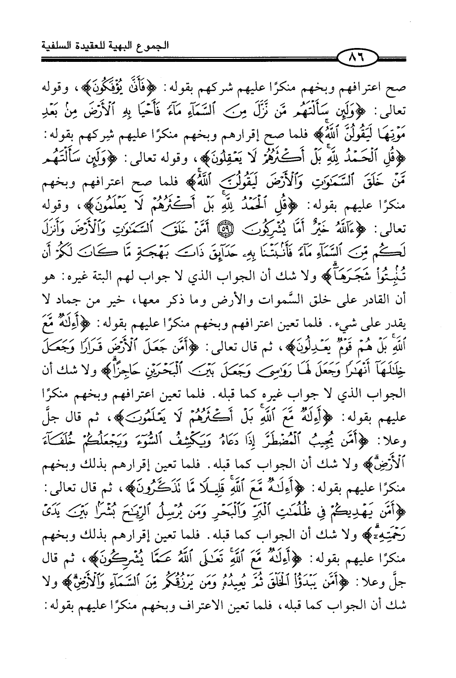 أَكْثَرُهُمْ لاَ يَعْقِلُونَ) ، وَقَوله تَعَالَى: (وَلَئِن سَأَلْتَهُمْ مَّنْ خَلَقَ السَّمَاوَاتِ وَالأَرْضَ لَيَقُولُنَّ اللَّهُ) فَلَمَّا صَحَّ اعْتِرَافُهُمْ وَبَّخَهُمْ مُنْكِرًا عَلَيْهِمْ بِقَوْلِهِ: (قُلِ الْحَمْدُ لِلَّهِ بَلْ أَكْثَرُهُمْ لاَ يَعْلَمُونَ) ، وَقَوله تَعَالَى: (آللَّهُ خَيْرٌ أَمَّا يُشْرِكُونَ أَمَّنْ خَلَقَ السَّمَاوَاتِ وَالأَرْضَ وَأَنزَلَ لَكُمْ مِّنَ السَّمَآءِ مَآءً فَأَنبَتْنَا بِهِ حَدَآئِقَ ذَاتَ بَهْجَةٍ مَّا كَانَ لَكُمْ أَن تُنبِتُواْ شَجَرَهَا) وَلَا شَكَّ أَنَّ الْجَوَابَ الَّذِي لَا جَوَابَ لَهُمُ الْبَتَّةَ غَيْرُهُ: هُوَ أَنَّ الْقَادِرَ عَلَى خَلْقِ السَّماوات وَالْأَرْضِ وَمَا ذَكَرَ مَعَهَا، خَيْرٌ مِنْ جَمَادٍ لَا يَقْدِرُ عَلَى شَيْءٍ. فَلَمَّا تَعَيَّنَ اعْتِرَافُهُمْ وَبَّخَهُمْ مُنْكِرًا عَلَيْهِمْ بِقَوْلِهِ: (أَاله مَّعَ اللَّهِ بَلْ هُمْ قَوْمٌ يَعْدِلُونَ) ، ثُمَّ قَالَ تَعَالَى: (أَمَّن جَعَلَ الأَرْضَ قَرَاراً وَجَعَلَ خِلاَلَهَآ أَنْهَاراً وَجَعَلَ لَهَا رَوَاسِىَ وَجَعَلَ بَيْنَ الْبَحْرَيْنِ حَاجِزاً) وَلَا شَكَّ أَنَّ الْجَوَابَ الَّذِي لَا جَوَابَ غَيْرُهُ كَمَا قَبْلَهُ. فَلَمَّا تَعَيَّنَ اعترافهم وبخهم مُنْكرا عَلَيْهِم بقوله: (أَءِلاهٌ مَّعَ اللَّهِ بَلْ أَكْثَرُهُمْ لاَ يَعْلَمُونَ) ، ثُمَّ قَالَ جلَّ وَعَلَا: (أَمَّن يُجِيبُ الْمُضْطَرَّ إِذَا دَعَاهُ وَيَكْشِفُ السُّو?ءَ وَيَجْعَلُكُمْ حُلَفَآءَ الأَرْضِ) وَلَا شَكَّ أَنَّ الْجَوَابَ كَمَا قَبْلَهُ. فَلَمَّا تَعَيَّنَ إِقْرَارُهُمْ بِذَلِكَ وَبَّخَهُمْ مُنْكِرًا عَلَيْهِمْ بقوله: (أَءِلَاهٌ مَّعَ اللَّهِ قَلِيلاً مَّا تَذَكَّرُونَ) ، ثُمَّ قَالَ تَعَالَى: (أَمَّن يَهْدِيكُمْ فِى ظُلُمَاتِ الْبَرِّ وَالْبَحْرِ وَمَن يُرْسِلُ الرِّيَاحَ بُشْرًى بَيْنَ يَدَىْ رَحْمَتِهِ) وَلَا شَكَّ أَنَّ الْجَوَابَ كَمَا قبله.