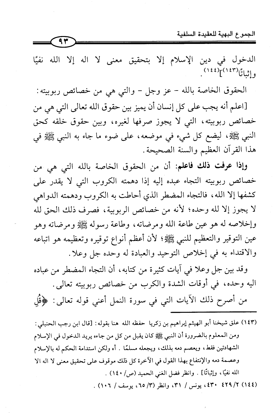 الَّتِي لَا يَجُوزُ صَرْفُهَا لِغَيْرِهِ، وَبَيْنَ حُقُوقِ خَلْقِهِ كَحَقِّ النَّبِيِّ صَلَّى اللَّهُ عَلَيْهِ وَسَلَّمَ، لِيَضَعَ كُلَّ شَيْءٍ فِي مَوْضِعِهِ، عَلَى ضَوْءِ مَا جَاءَ بِهِ النَّبِيُّ صَلَّى اللَّهُ عَلَيْهِ وَسَلَّمَ فِي هَذَا الْقُرْآنِ الْعَظِيمِ وَالسُّنَّةِ الصَّحِيحَةِ.